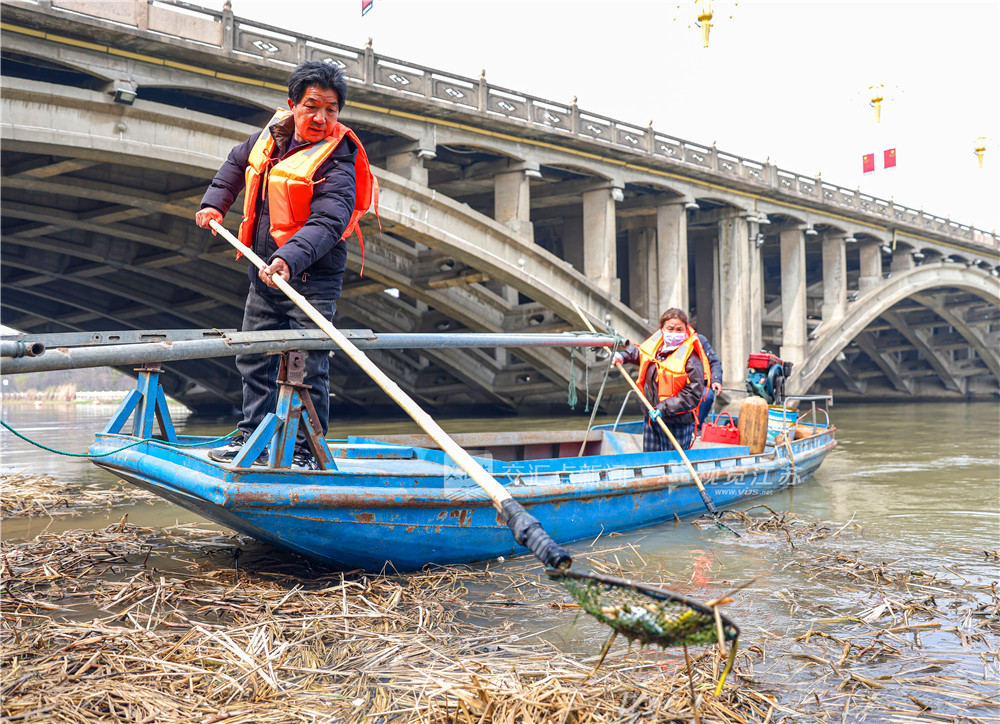 (特约摄影 任飞 10:23 摄 16:12上线)3月20日,扬州市江都区,当地水务部门组织环保志愿者在南水北调东线输水重要通道的新通扬运河上清理河面漂浮物。