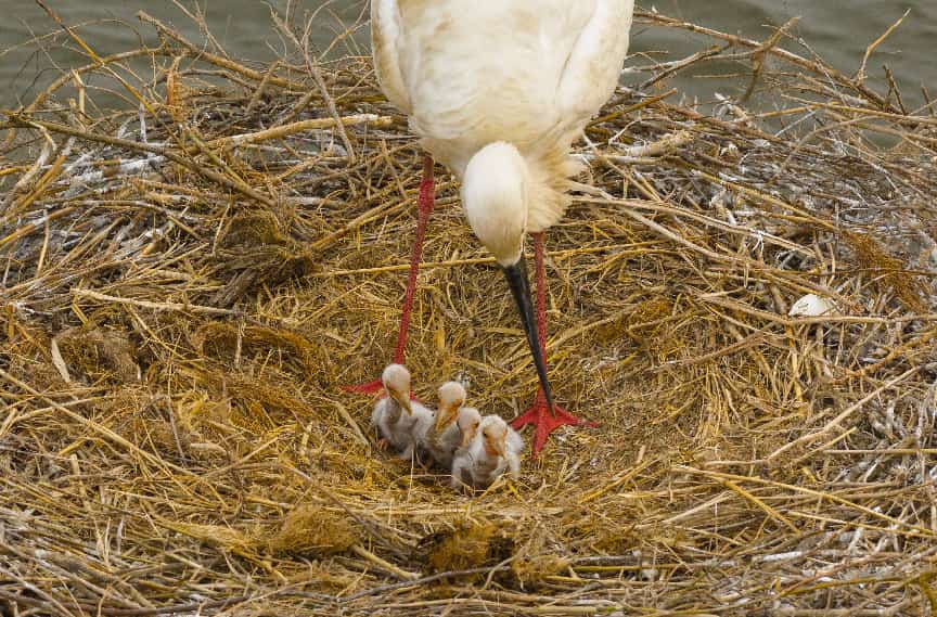 工作人员介绍,东方白鹳通常选择在人迹罕至的区域筑巢,雌雄亲鸟轮流承担孵化任务,历时约30天顺利完成孵化。亲鸟分工明确,一只留守看护幼崽、调节体温,另一只往返觅食,精心喂养,尽显温情。东方白鹳每窝通常产卵3至5枚,此次成功孵化四只幼崽,存活率较高,实属不易。