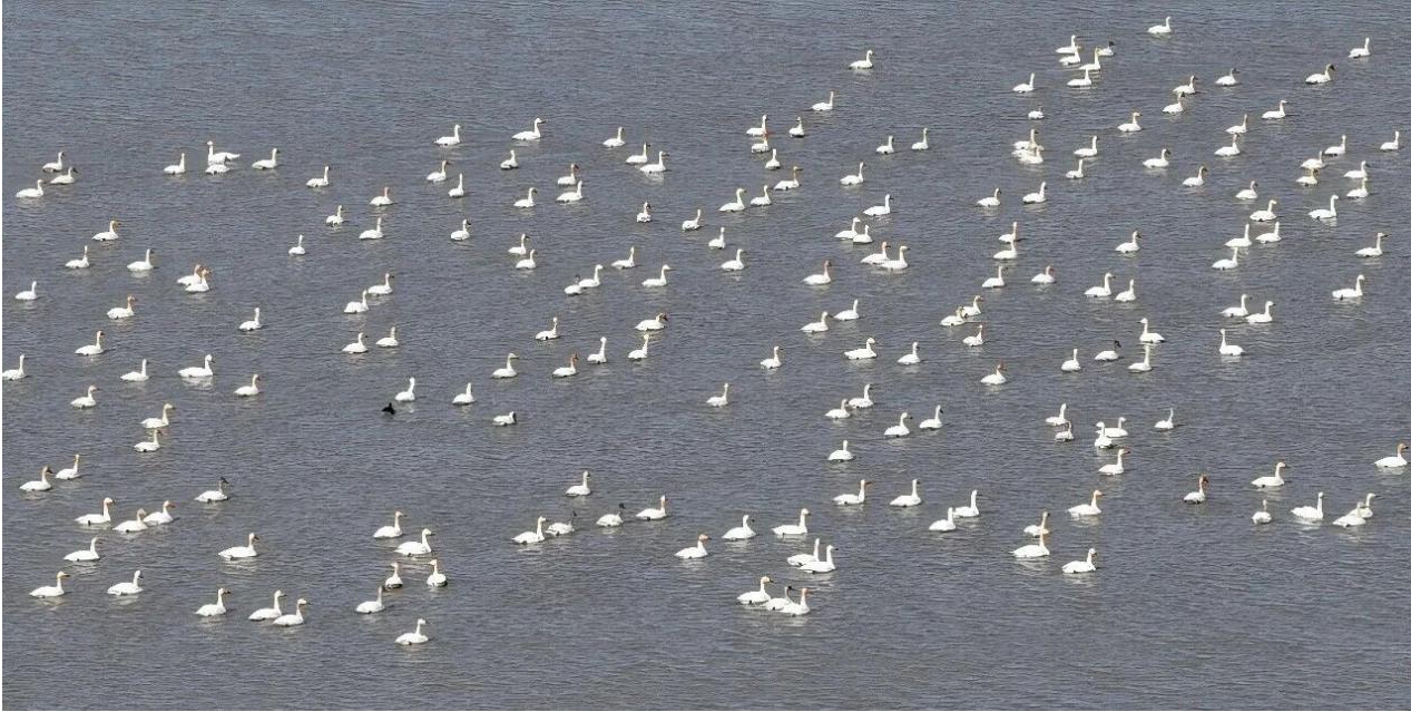 记者了解到,3月12日清晨七点,保护区巡护监测团队在核心区湿地水域开展常规巡护时,远远望见水面上成片雪白的身影。经仔细观测、计数,确认这群水鸟为天鹅,总数达966只。它们在水中悠闲游弋,构成一幅灵动的春日生态画卷。