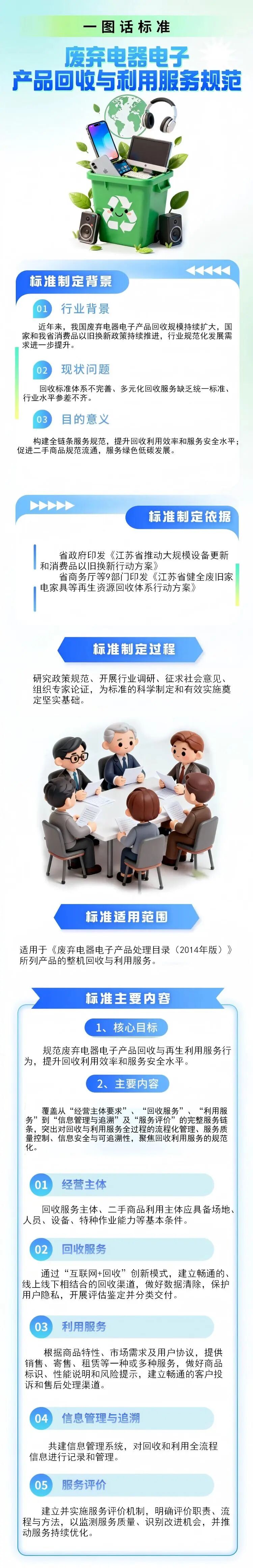 该标准规范废弃电器电子产品整机回收与利用服务,有助于提升资源利用效率,推动绿色循环利用,标志着江苏废弃电器电子产品回收利用行业迈入规范化、标准化新阶段,为以旧换新政策落地、绿色消费升级和循环经济发展筑牢制度基础。