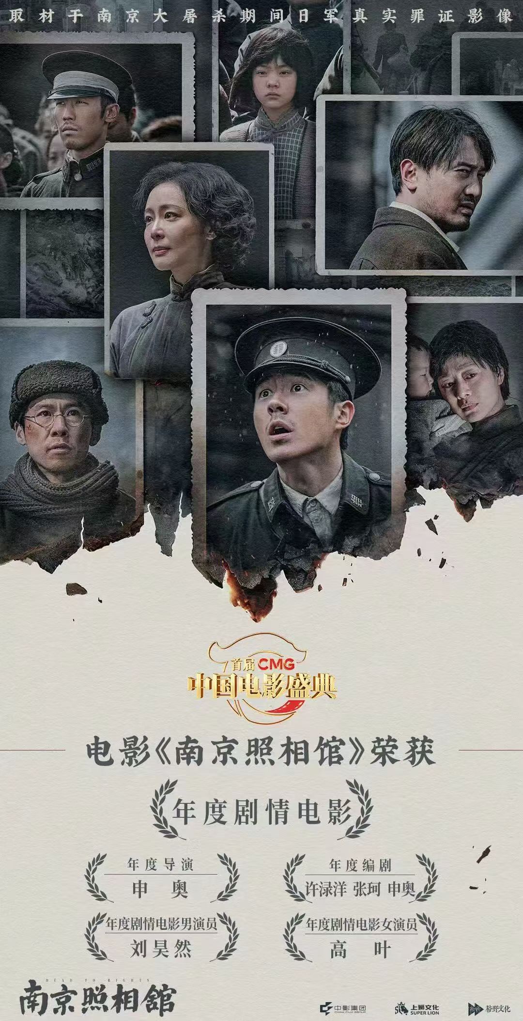 交汇点讯 3月20日晚,首届CMG中国电影盛典中,电影《南京照相馆》横扫重磅荣誉:《南京照相馆》获评“年度剧情电影”,导演申奥获评“年度导演”;许渌洋、张珂、申奥获评“年度编剧”;高叶获评“年度剧情电影女演员”;刘昊然获评“年度剧情电影男演员”。
