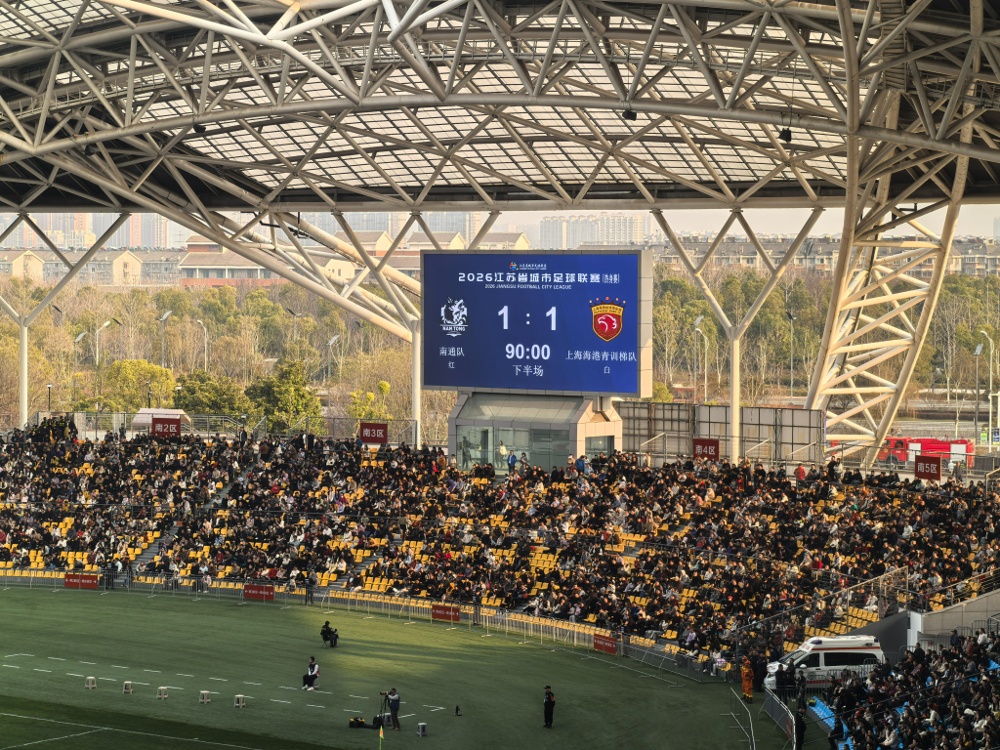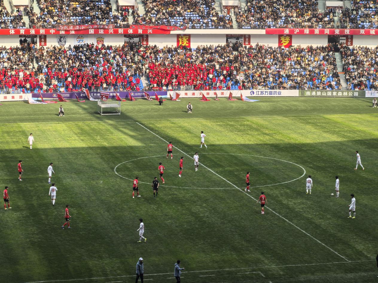 开场20分钟左右,客队上海海港青训梯队率先破门,19号球员任晓航踢进一球。第34分钟,南通队22号球员程薛坤大禁区外沿摆脱防守,一脚劲射轰开对方球门。上半场,双方打成1∶1。易边再战,双方未能改写比分,最终握手言和。本场热身赛为南通队提供了充分的锻炼机会,主教练金都根安排了更多球员出场,演练各种战术组合。