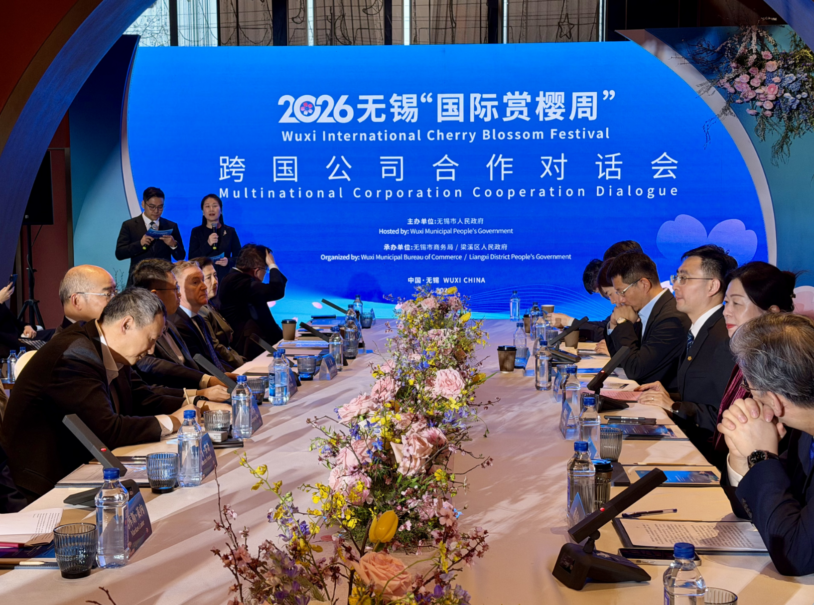 交汇点讯 春染太湖畔,樱开四海情。3月24日,2026无锡“国际赏樱周”跨国公司合作对话会在无锡举行。作为无锡“国际月”系列活动的核心活动之一,本次对话会汇聚全球近40家知名跨国公司、商协会高层,围绕高端装备、生物医药、绿色能源、人工智能等战略性新兴产业领域共商合作机遇,共谋发展新篇。