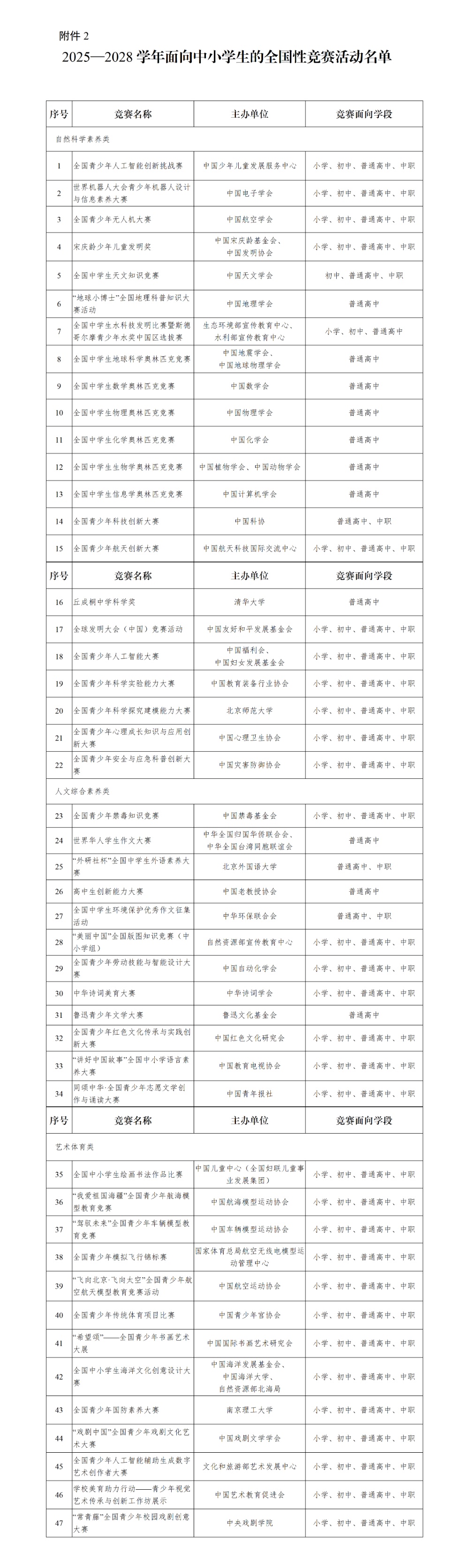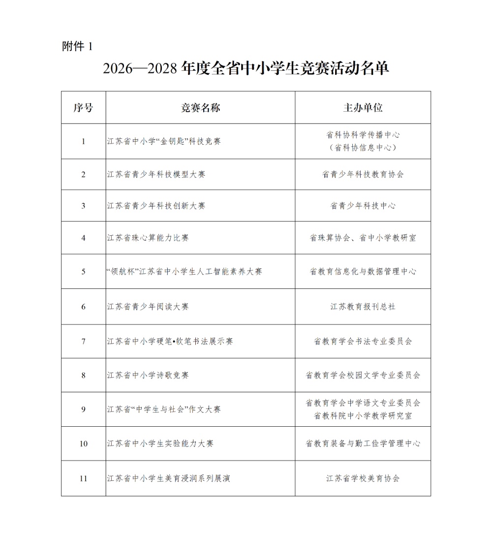 交汇点讯 3月25日,江苏省教育厅公布2026—2028年度全省中小学生竞赛活动名单和江苏省中小学生参加的全国竞赛活动名单。其中,2026—2028年度全省中小学生竞赛活动名单包括江苏省中小学“金钥匙”科技竞赛等11项竞赛活动,江苏省中小学生参加的全国竞赛活动名单包括全国青少年人工智能创新挑战赛等47项竞赛活动。