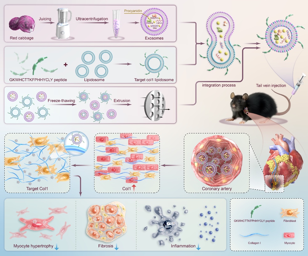 该项研究实现双重创新,首次将紫甘蓝外泌体工程化,构建成胶原靶向纳米递送系统;首次证实紫甘蓝外泌体可通过调控特定信号通路,干预心梗后炎症与纤维化,拓展了植物源生物材料在心血管疾病治疗中的应用前景。