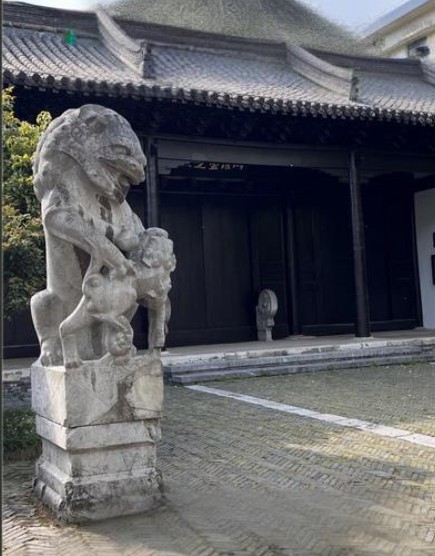 在小金山网红“笑狮”的南面徐园门前,也有一对兼具北方和南方风格的石狮。其雄狮踩绣球,象征寰宇一统,雌狮抚幼狮,象征子嗣绵延。两石狮均是歪头侧视,净高约1.6米,比大明寺清代“正头狮”矮小,尺度适配江南园林的雅致氛围。雕工精细、线条柔和,狮子毛发呈细密螺旋纹、狮身敦厚圆润、姿态恭顺不威严,兼具南方园林狮的憨态与北方皇家狮的规整,是晚清扬州融合南北风格的典型民间狮雕。
