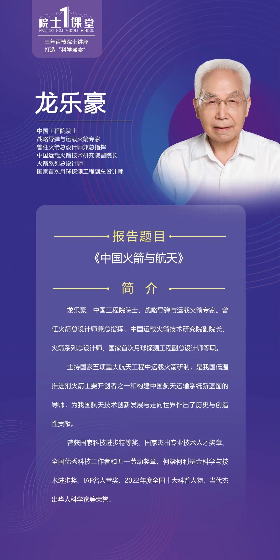 交汇点讯 近日,中国工程院院士、火箭总设计师兼总指挥龙乐豪,携六十余载航天赤诚,走进南京市第一中学“院士1课堂”,为师生们带来《中国火箭与航天》的讲座,细数航天梦。