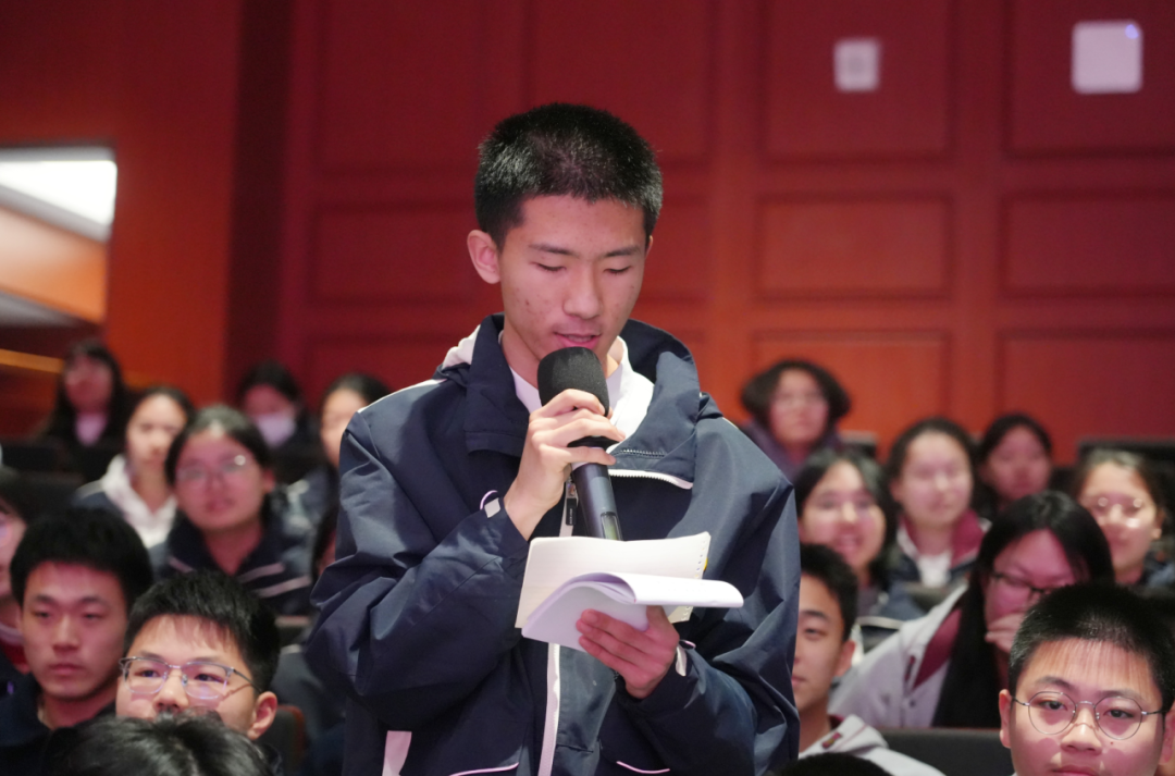 高二16班杨奕淳同学向院士提问:“龙院士您好!您在中国火箭设计中有很高的成就,是一位出类拔萃的前辈,在您的青年时期,在条件那么艰苦的情况下,是什么因素或者是有什么样的故事激励着您投入祖国的航天工程事业?”
