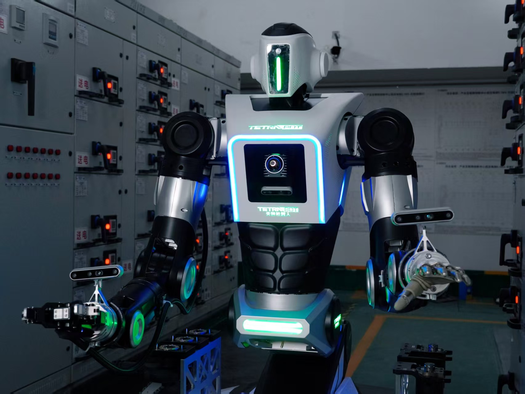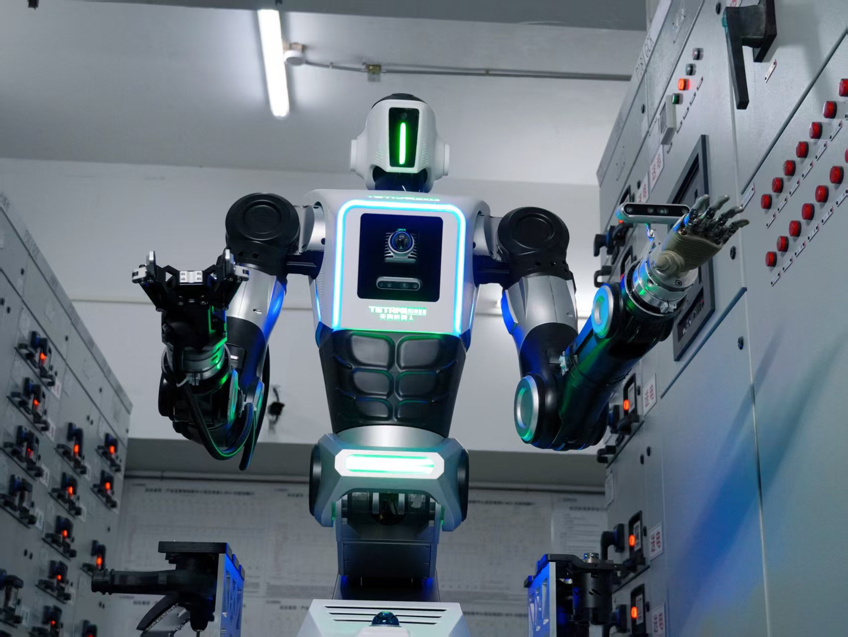 记者看到,“天魁1号”采用半人形架构,高性能轮式、履带式底盘,让它在复杂地面上移动时稳如磐石。其身高展开可达2.2米,粗壮的机械臂灵活有力,单臂负载超25公斤,搭配可自主快换的14种末端工具,能精准完成阀门开闭、开关启停、切割破拆、重物搬运等一系列高难度作业。在危化品泄漏、火灾等场景模拟演示中,它动作流畅、反应迅速,完美替代人类完成高危操作,展现出强大的应急救援与作业能力。