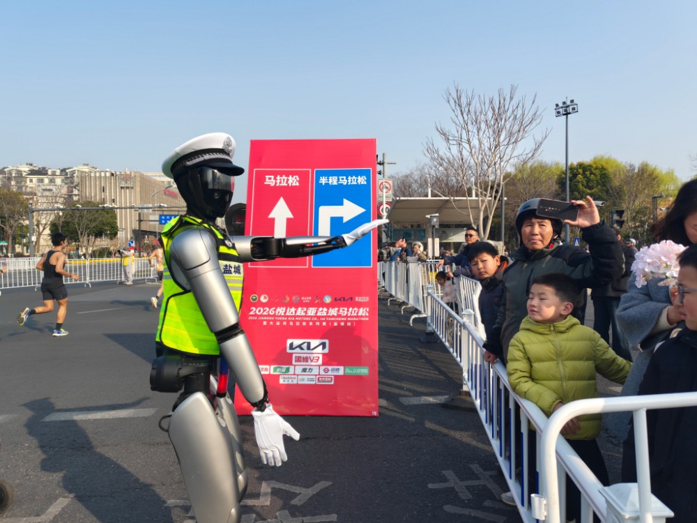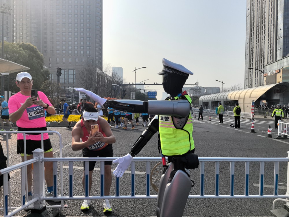 3月22日,2026无锡马拉松鸣枪开跑。在如织的人潮中,赛道旁几台交管机器人格外引人注目。它们时而精准按照交管标准手势指挥交通,时而灵活做出“点赞”等互动动作,时而化身“移动答疑站”实时响应选手各类咨询。同一天,杭州西湖半程马拉松也迎来交管机器人上岗。