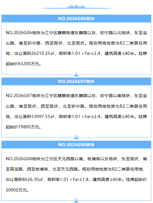 此外,城东麒麟、浦口桥林各推出2幅地块,六合龙袍新城推出3幅地块。
