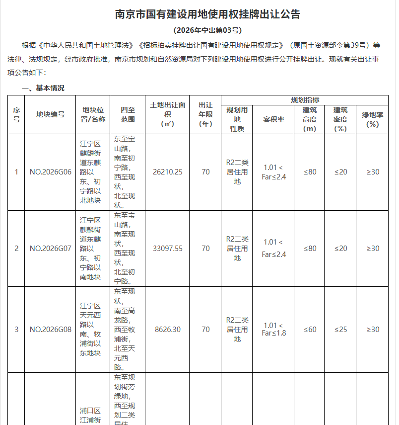 交汇点讯 3月31日晚,南京发布国有建设用地使用权挂牌出让公告(2026年宁出第03号),推出6幅二类居住用地、2幅住宅用地、1幅商住混合用地,用地面积约22.66公顷,起拍总价40.23亿元。公告地块将于4月29日上午9:30开始网上限时竞价。
