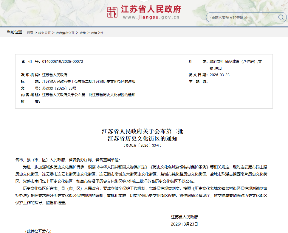 交汇点讯 近日,江苏省人民政府公布第二批江苏省历史文化街区,连云港市民主路历史文化街区、连云港市连云老街历史文化街区、连云港市南城东大街历史文化街区、盐城市纯化路历史文化街区、盐城市珠溪古镇西南片历史文化街区、常熟市南门坛上历史文化街区、如皋市集贤里历史文化街区等7处入选。