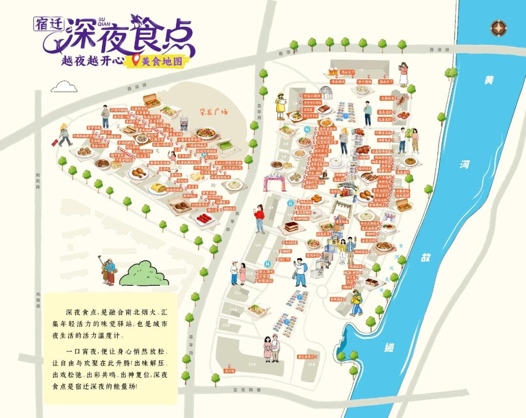 深夜食点——夜经济是城市的活力底色。文旅局从较为成熟的市区宝龙24街出发,整合宿城区和宿豫区的潮流夜市,扩展到沭阳、泗阳、泗洪等各县的特色晚间市集,初步形成了各具特色、全域联动的夜间消费集群。各地的“深夜食点”不仅让市民游客有更多逛吃选择,拉长休闲时光,更带动了夜间餐饮、零售、娱乐消费,让宿迁的夜晚更热闹、更有烟火气。