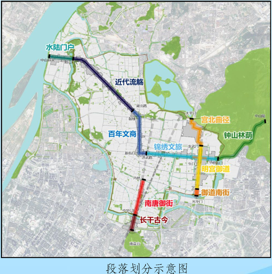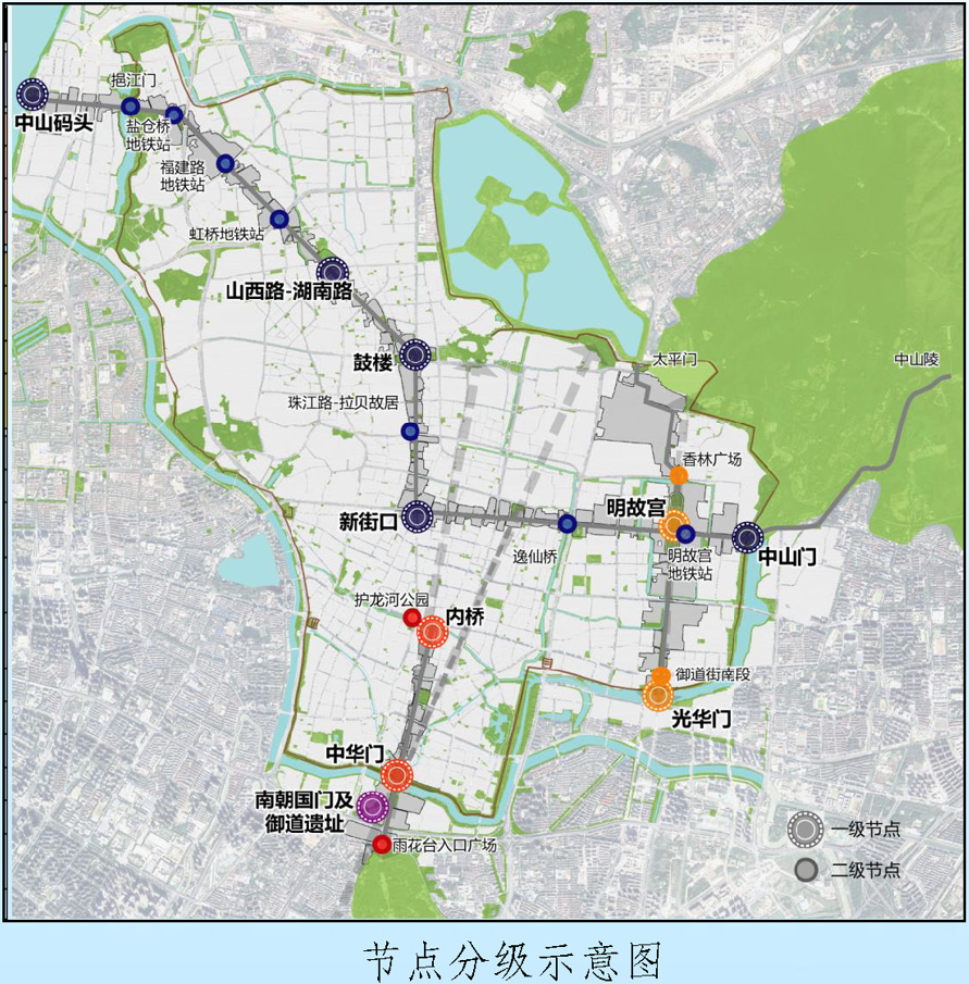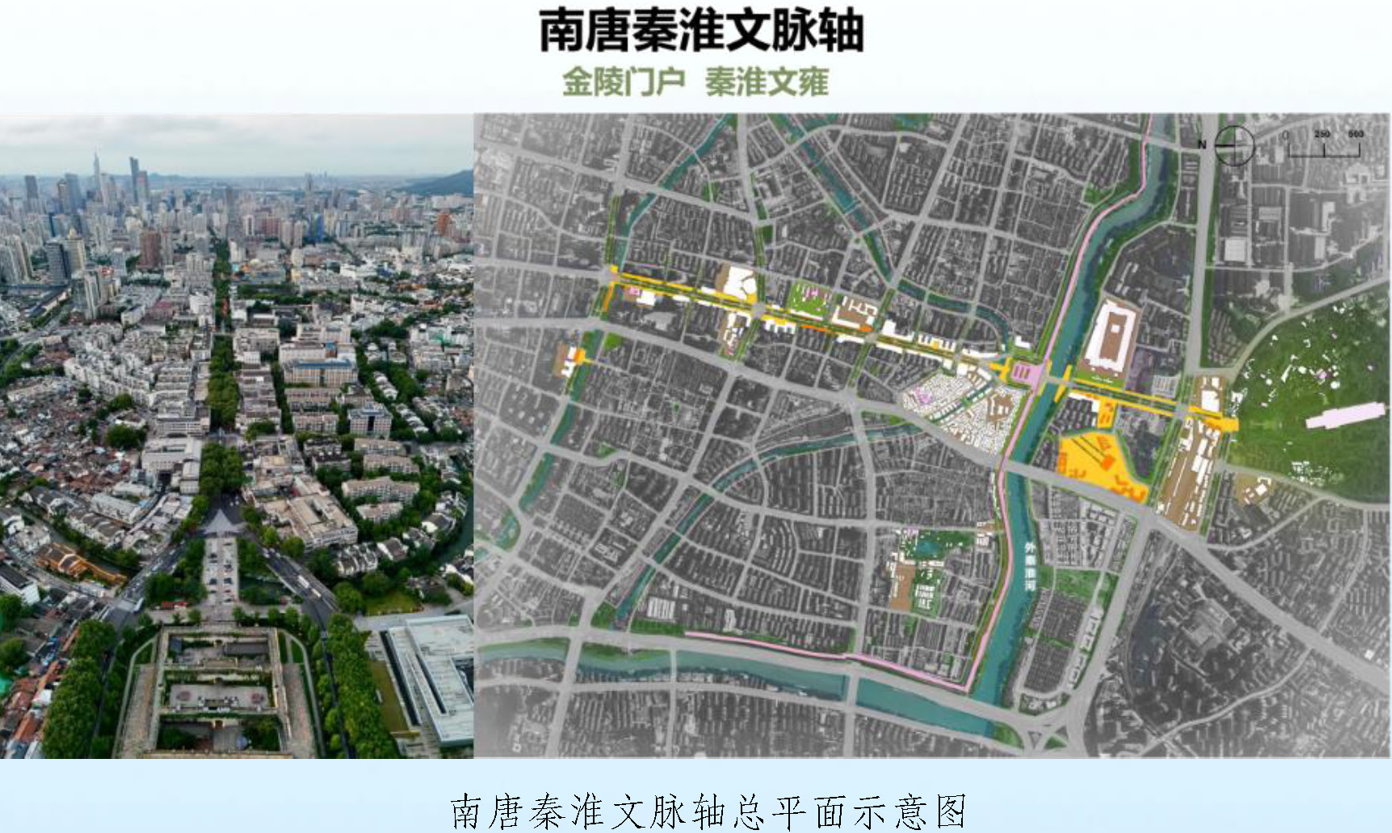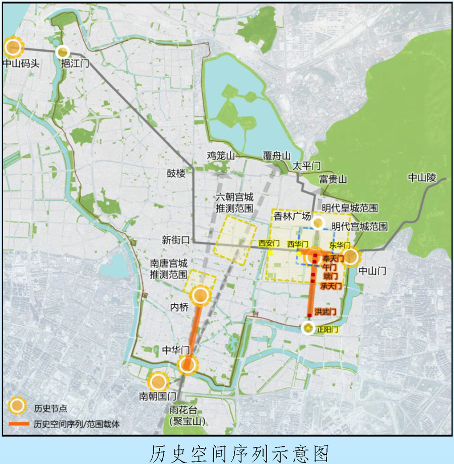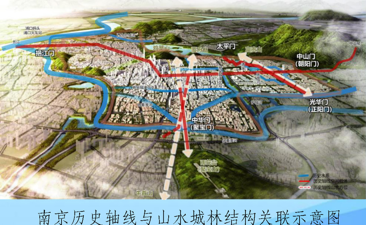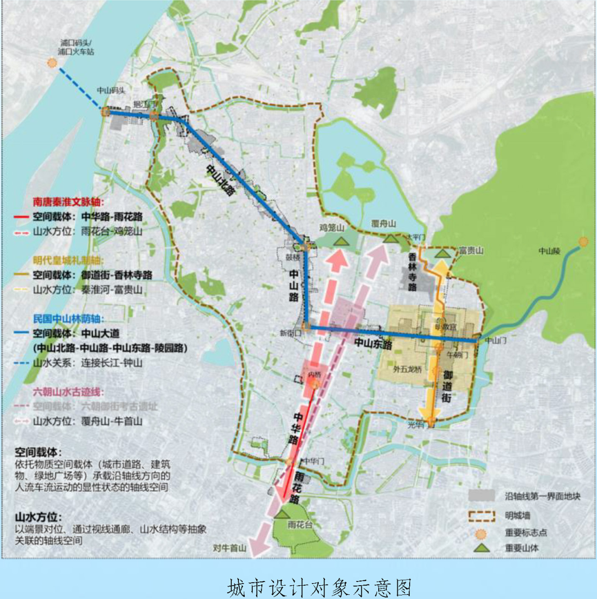原三条轴线分别为南唐秦淮文脉轴、明代皇城礼制轴、民国中山林荫轴。考虑到六朝对南京城市发展的重要肇始意义,此次城市设计在三轴以外,新增一线——六朝山水古迹线。