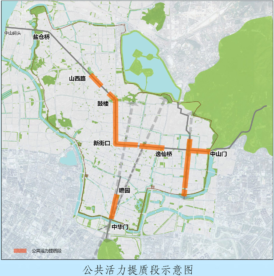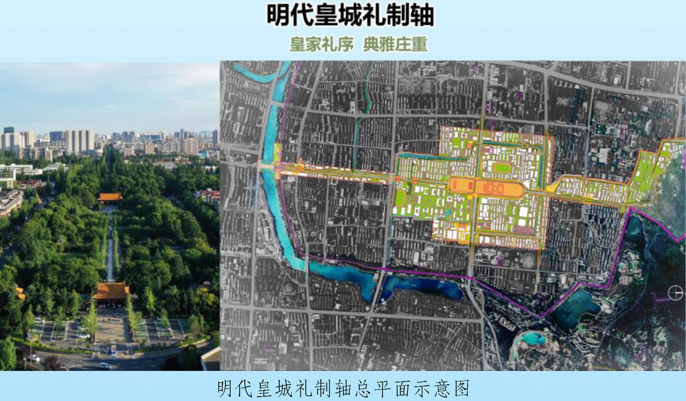 提示历史遗存、关节位置、空间序列,使历史可读可感,展示历史关节。提示历史遗存范围,通过地面铺装变化、街道标识、数字化展示等措施,提示明代宫城范围、南唐御道等。多元方式展示明代皇城轴线上的“三朝五门”空间序列。夜景照明系统展现历史轴线、明城墙、历史水系等线性结构,并强化其交汇点。