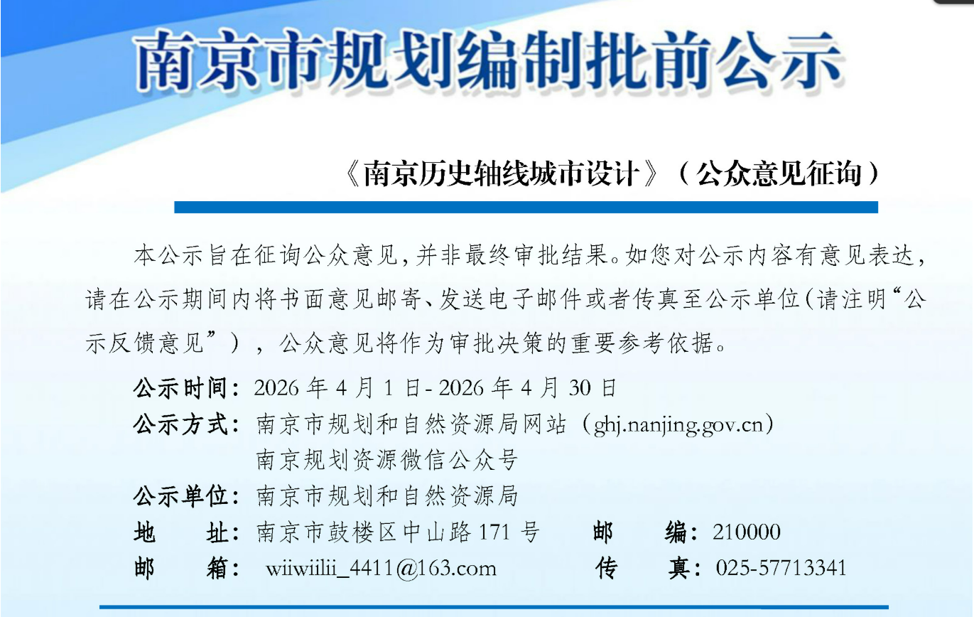 交汇点讯 南京市规划和自然资源局4月1日起就《南京历史轴线城市设计》公开征求意见,该设计明确南京的历史轴线为“三轴一线”,提出8大设计策略18条设计指引,为今后历史轴线沿线老城更新提供可操作、可传导的管控依据。
