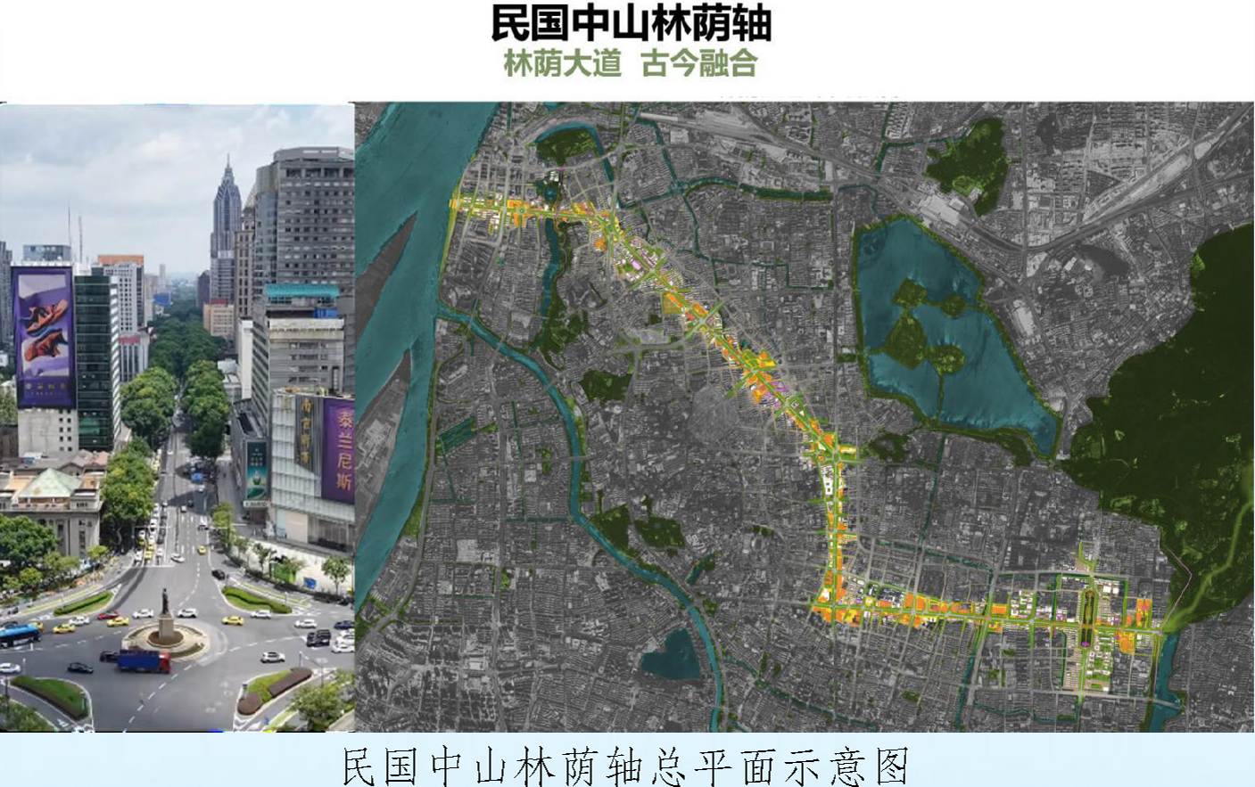 民国中山林荫轴是中国城市第一条现代化林荫大道,是汇聚近现代城市公共建筑的文化长廊,也是近现代南京老城的发展之轴;