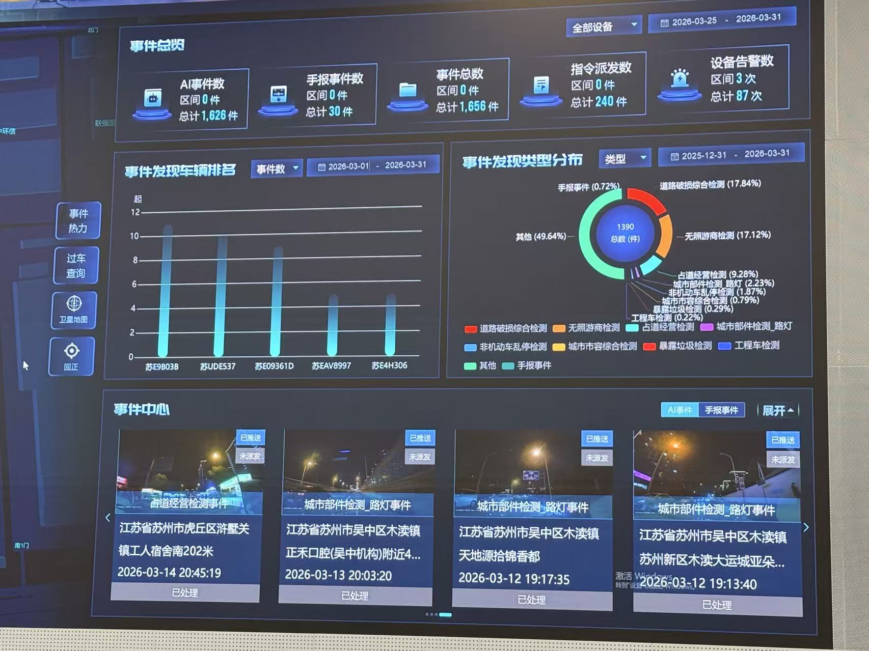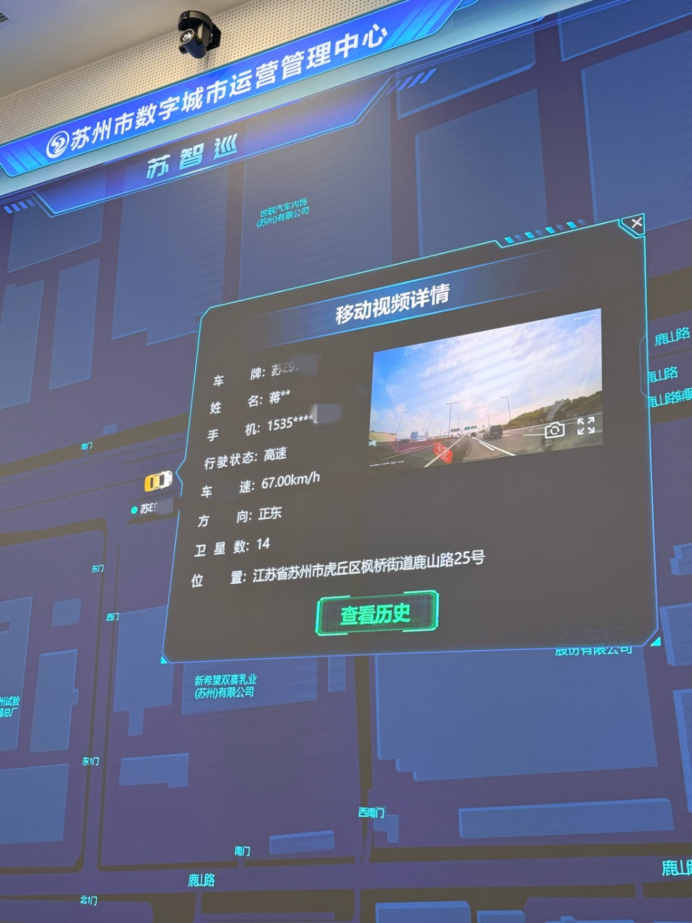 在管理中心,徐浩紧盯数字大屏,平台推出的车载AI巡检系统——“苏智巡”正实时更新数据。“系统目前已搭载9辆运营车辆,涵盖2辆公交车、2辆执法车及若干出租车,形成多元化巡检载体。”徐浩表示,“苏智巡”的核心设备为安装在车辆挡风玻璃前的AI摄像头,外观类似普通行车记录仪,却集成了智能识别与5G网络传输功能,可实时将巡检数据与视频画面回传至城运中心,确保问题发现及时、数据传输高效。