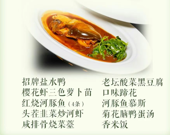 河豚双人套餐包含招牌盐水鸭、家烧老豆腐、红烧河豚鱼、咸肉河蚌烧菜薹,搭配酸奶杯与香米饭,道道精致,鲜而不腻,让两人轻松畅享春日美味。河豚四人套餐则更为丰盛,除招牌盐水鸭、红烧河豚鱼外,还增添樱花虾三色萝卜苗、头茬韭菜炒河虾、咸排骨烧菜薹、老坛酸菜黑豆腐、口味蹄花、河豚鱼慕斯、菊花脑鸭蛋汤等菜品,荤素搭配、层次丰富,既突出河豚的核心鲜味,又融合南京本地家常风味与春季时蔬,尽显江南饮食之雅致。