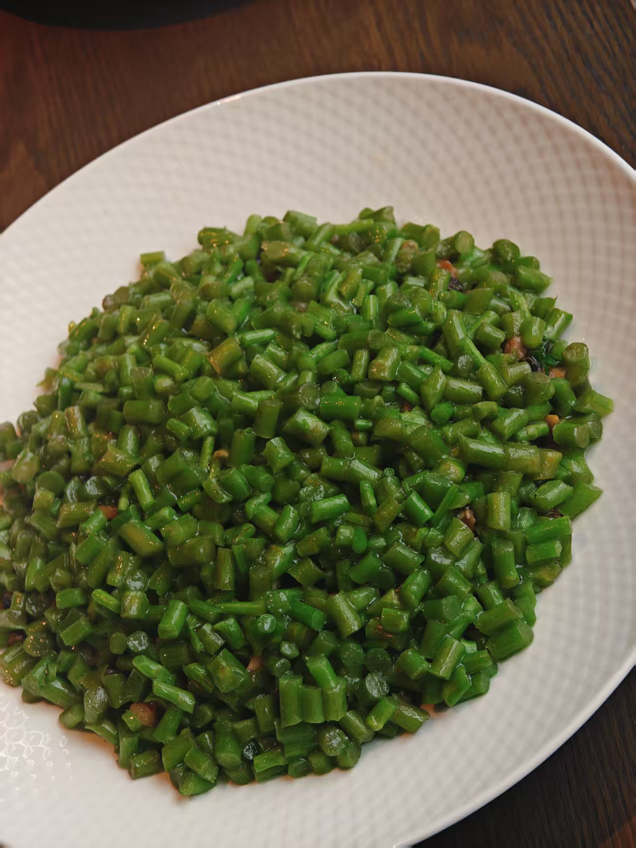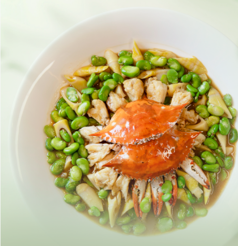 行政总厨沈师傅介绍,梭子蟹烧豆瓣春笋是海鲜与春蔬的经典碰撞,饱满的梭子蟹肉质鲜甜,豆瓣的绵密与春笋的脆嫩相得益彰,入口层次丰富,鲜而不腻。秧草火腿蒸白鱼,以咸香衬托江鲜之嫩,入口滑嫩,鲜醇回甘。荠菜春笋银鳕鱼羹则以柔滑口感征服味蕾,兼具美味与养生之效。