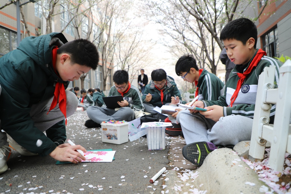 户外写生课上,孩子们在学校樱花树下席地而坐,手握画笔细细勾勒春日轮廓。每一笔色彩都藏着对春天的感知,每一幅画作都承载着童真的想象,自然之美与艺术之美在画纸上交融。金陵河西学校小学部学生吴钰滢兴奋地告诉记者:“我和我的同学们一起到樱花大道来画我们学校的樱花,先用浅色的丙烯马克笔画出很多圈,然后再在周围点上点,最后用深色的加深画出主干。”据美术老师陈天岚介绍:“春假的校内托管,我们希望孩子不被困在教室,也能好好地享受春天。在美术活动设计上,我们立足校园本身的自然环境,把自然探索和美育活动结合起来。我们组织学生们在校园里寻找春天,观察花草树木,让孩子们到户外走一走,看一看,舒展身心。同时,也兼顾安全与秩序,老师会全程陪同,让托管不仅仅是看护。更是一场贴近自然的美育体验,让孩子们在校内也能不负春光、快乐成长。”