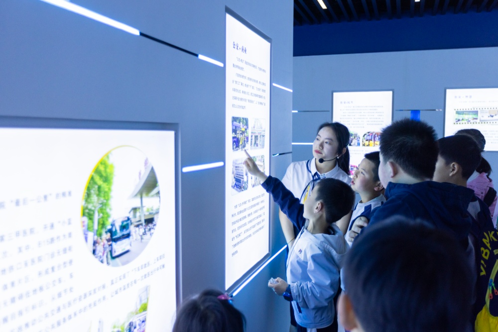 在南京公交百年历史发展文化馆,孩子们跟随讲解员走进一条“时光隧道”。馆内陈列着泛黄的旧车票、老票夹以及不同时期的公交车辆照片,从老式公交到新能源巴士,从人工调度到智能运营,展陈内容勾勒出南京公交近百年的变迁轨迹。几位小朋友趴在展柜前仔细端详老物件,不时向讲解员提问。
