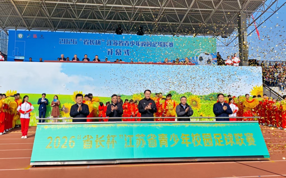 交汇点讯 4月2日,2026“省长杯”江苏省青少年校园足球联赛在南京开幕。现场,揭幕战在南京师范大学附属中学树人学校和江苏省江阴市第一初级中学两支队伍之间打响,副省长赵岩为揭幕战开球。