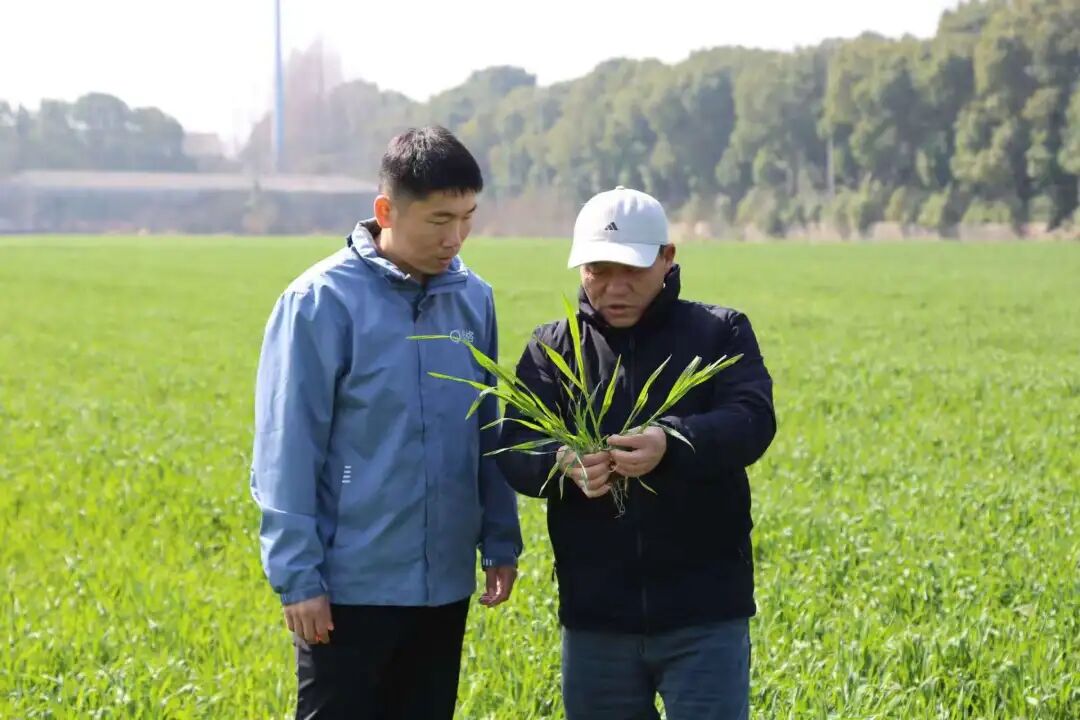 春风拂过田野,麦苗正拔节孕穗。站在田埂上,南京绿健农业发展有限公司负责人杨道前弯腰拨开一丛冬小麦,细数着分蘖数:“一个、两个、三个……这株有五个分蘖,长势很好。”他身后,5500亩麦田如绿色地毯铺展向远方。