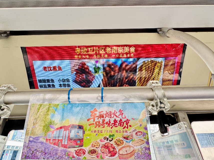 走进55路车厢,智能屏上每天滚动播报着孝陵卫周边菜场的当日菜价。更引人注意的是,屏幕里多了一个“美食推荐专区”——李荣兴清真馆的牛肉锅贴、老沈熏鱼、彪龙卤菜店的老卤鸭、老鼓楼汤包……图文并茂,一句句鲜活的介绍,仿佛把老南京的味道搬进了车厢。