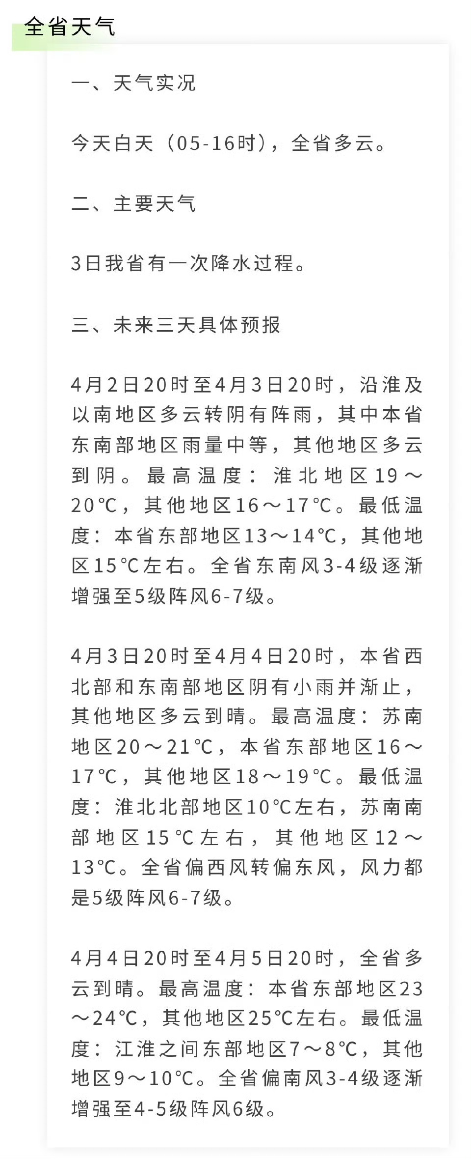4月3日20时至4日20时,西北部与东南部小雨渐止,其他地区多云到晴,苏南最高温20至21℃,东部16至17℃,其他地区18至19℃,淮北北部最低温10℃左右,苏南南部15℃左右,其他地区12至13℃,偏西风转偏东风,5级阵风6至7级。