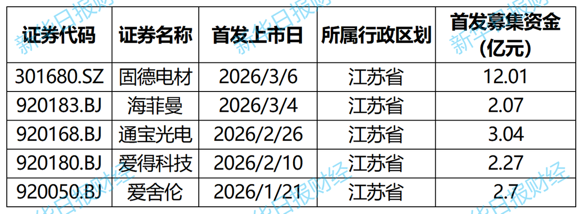 新华日报财经讯 随着3月31日A股、港股两地多只新股集中上市,2026年一季度资本市场IPO市场正式收官。据新华日报财经统计,2026年一季度,A股市场共有30家公司完成IPO,合计募集资金258.79亿元,较去年同期增加3家和约94亿元,增幅达57.07%。从板块分布看,北交所上市16家,占比过半;沪深交易所合计14家,其中科创板6家、沪市主板4家、创业板2家、深市主板2家。江苏在一季度共有5家企业登陆A股,分别是爱舍伦、爱得科技、通宝光电、海菲曼和固德电材,其中前4家在北交所上市,固德电材在创业板上市。
