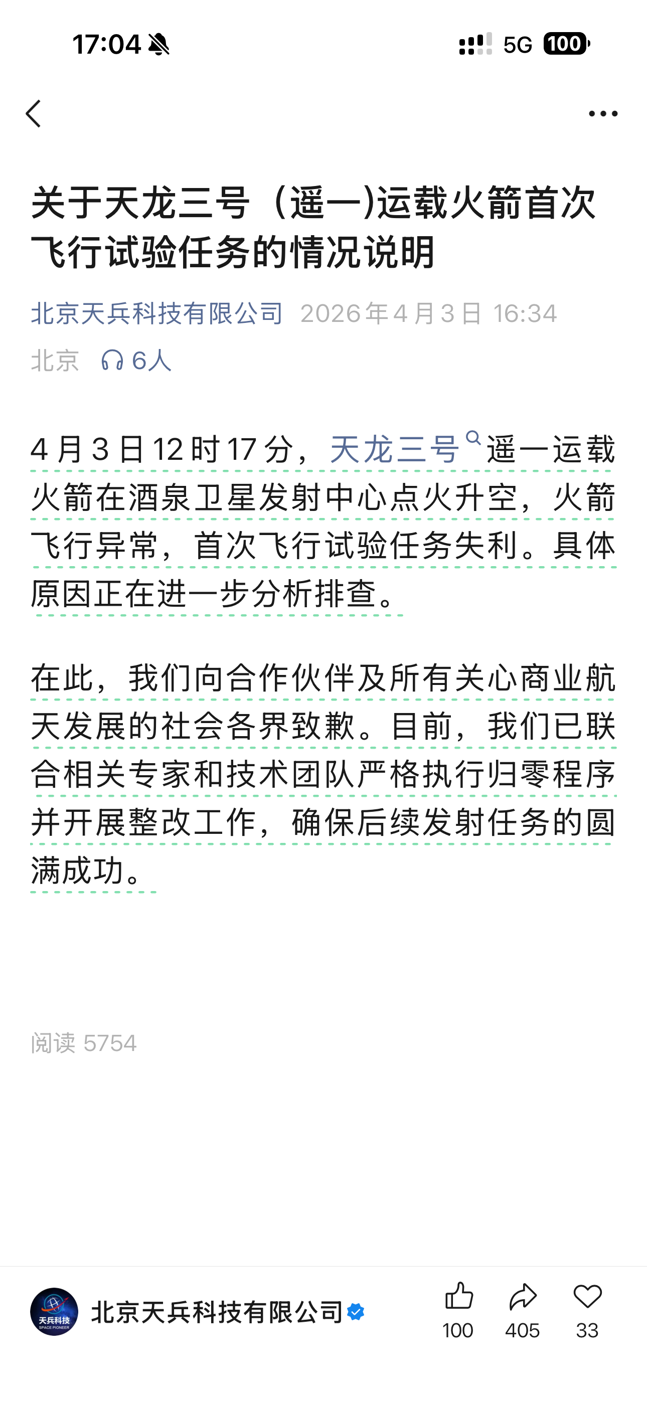 公司表示:“在此,我们向合作伙伴及所有关心商业航天发展的社会各界致歉。目前,我们已联合相关专家和技术团队严格执行归零程序并开展整改工作,确保后续发射任务的圆满成功。”