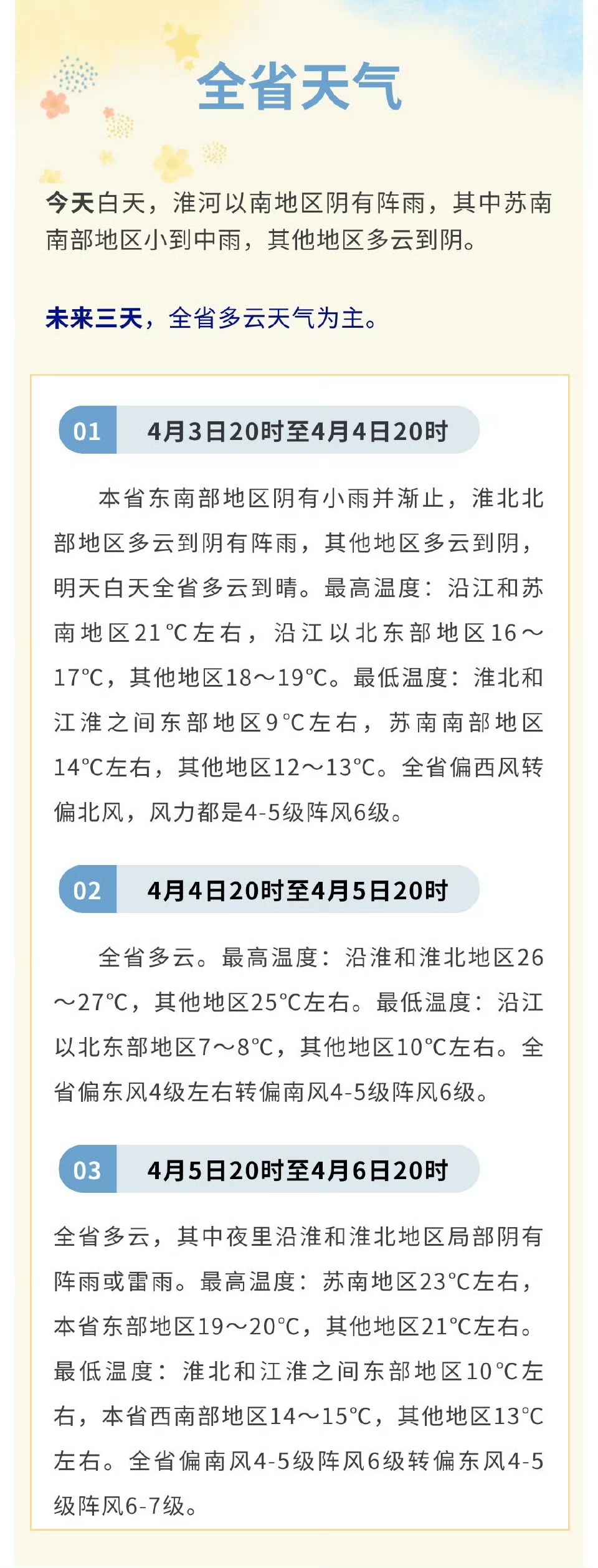 4月3日20时至4月4日20时,今天夜里本省东南部地区阴有小雨并渐止,淮北北部地区多云到阴有阵雨,其他地区多云到阴,明天白天全省多云到晴。最高温度:沿江和苏南地区21℃左右,沿江以北东部地区16~17℃,其他地区18~19℃。最低温度:淮北和江淮之间东部地区9℃左右,苏南南部地区14℃左右,其他地区12~13℃。全省偏西风转偏北风,风力都是4~5级阵风6级。