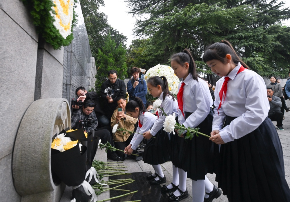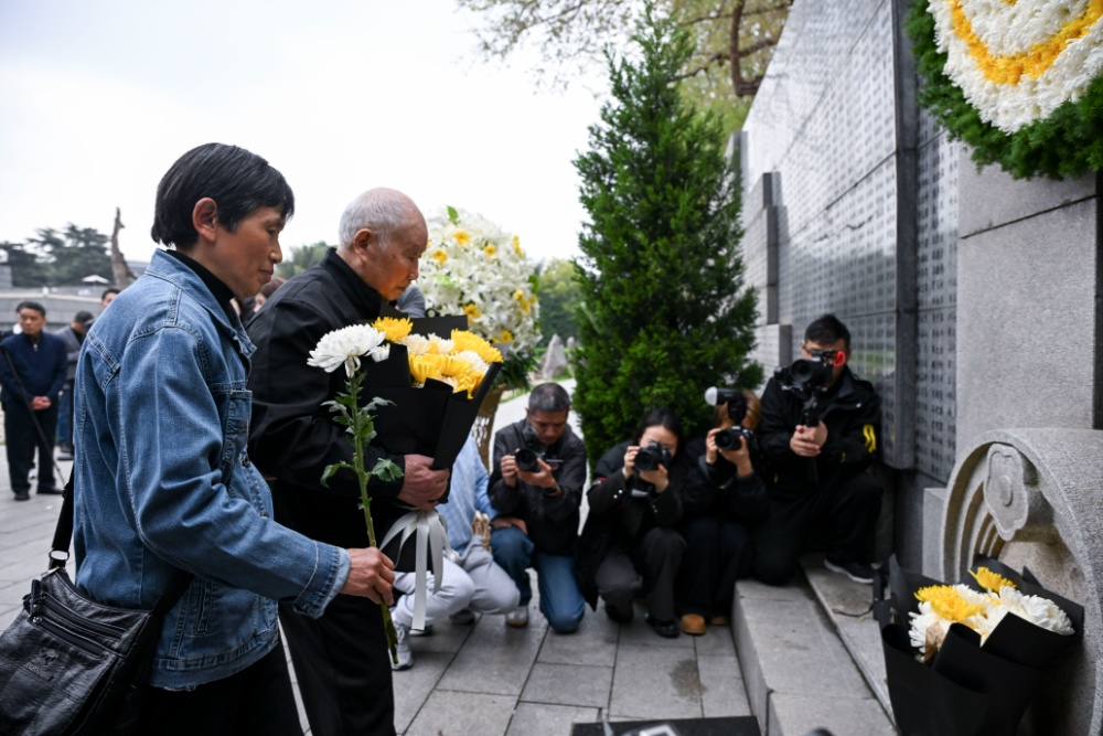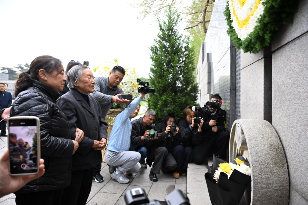 97岁的幸存者夏淑琴在家人的搀扶下,缓步走向遇难者名单墙。她颤巍巍地献上手中的菊花。谈及家族的惨痛遭遇,夏淑琴声音哽咽:“我心里很难受,日本为什么不敢承认历史?希望他们能来这里,看一看墙上的名字。”