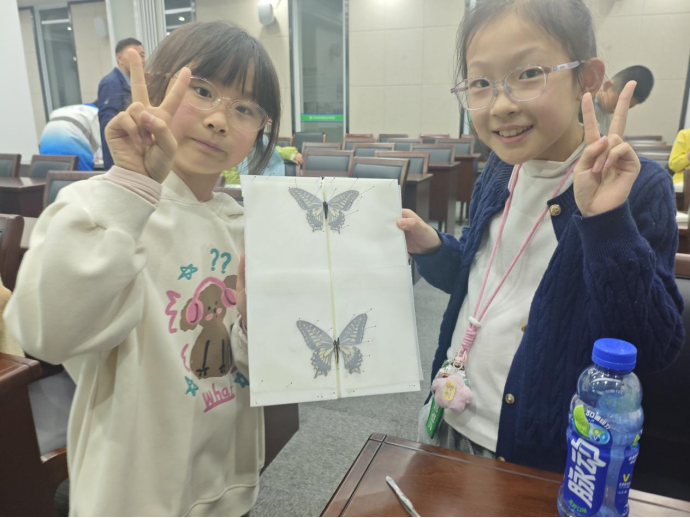 采集活动结束后孩子们带着“战利品”转移至室内。观看蝴蝶标本制作教学后,大家学习蝴蝶标本插针、展翅、整姿等核心技巧,孩子们小心翼翼调整蝴蝶翅膀、固定昆虫针,在导师与助教巡回指导下,每位小朋友独立完成了一份蝴蝶标本,放入标本盒永久保存。