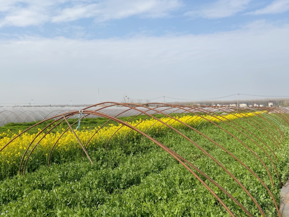 下坝村位于八卦洲东北角,小河穿村而过,两岸海棠次第绽放,田园阡陌,鸡犬相闻。这里不仅是一处“水美乡村”,更是南京重要的野菜供应基地。春分时节,走在田头,蓝天白云下,油菜花开得金黄耀眼。连栋大棚里,菊花脑舒展着锯齿状的嫩叶,绒毛上还沾着晨露;豌豆苗油绿肥嫩,趴满地面;马兰头绿意盎然,叶片底部泛着紫红。
