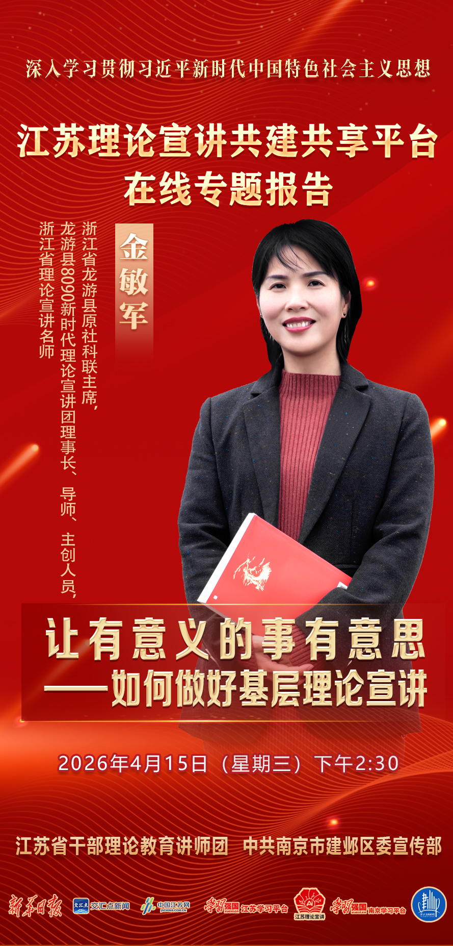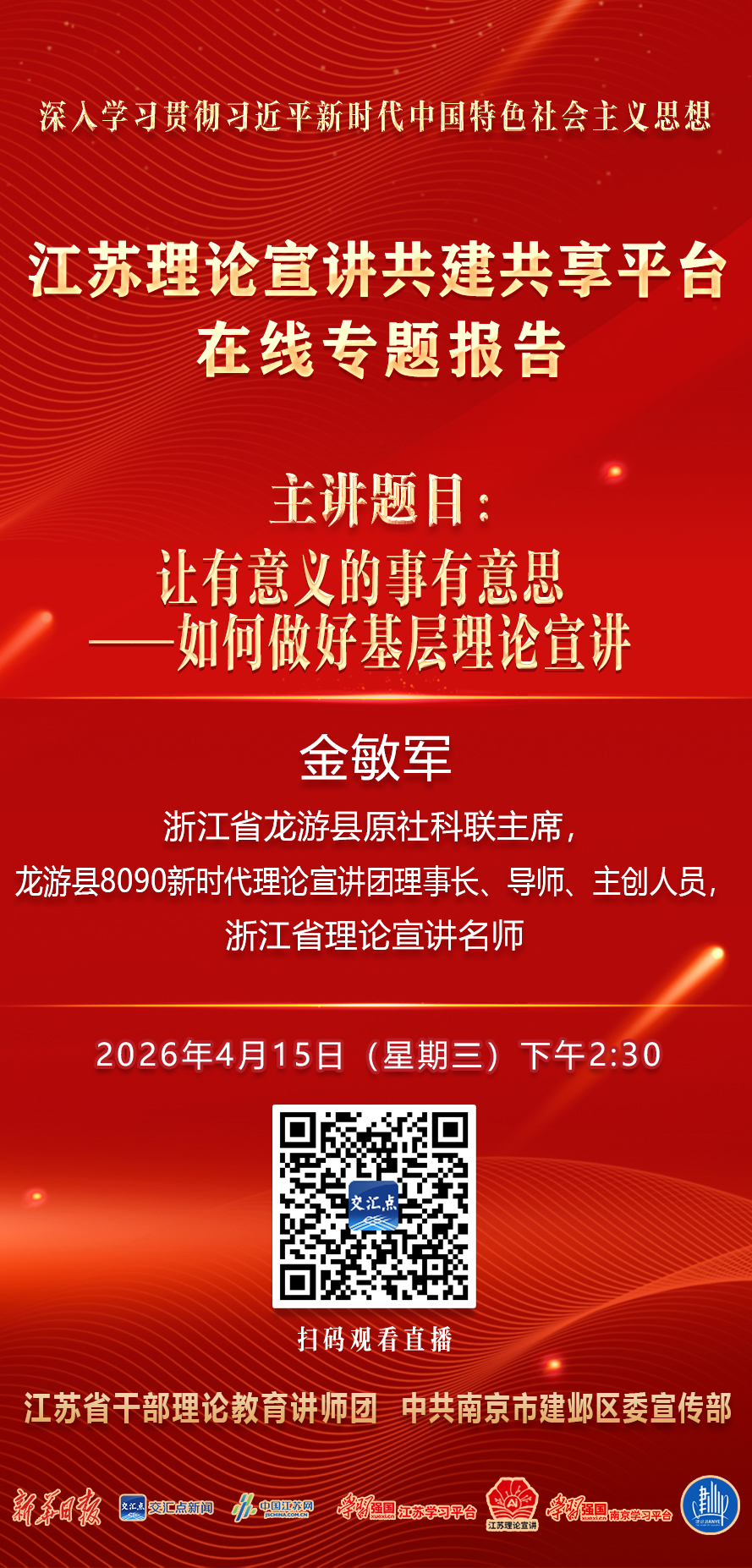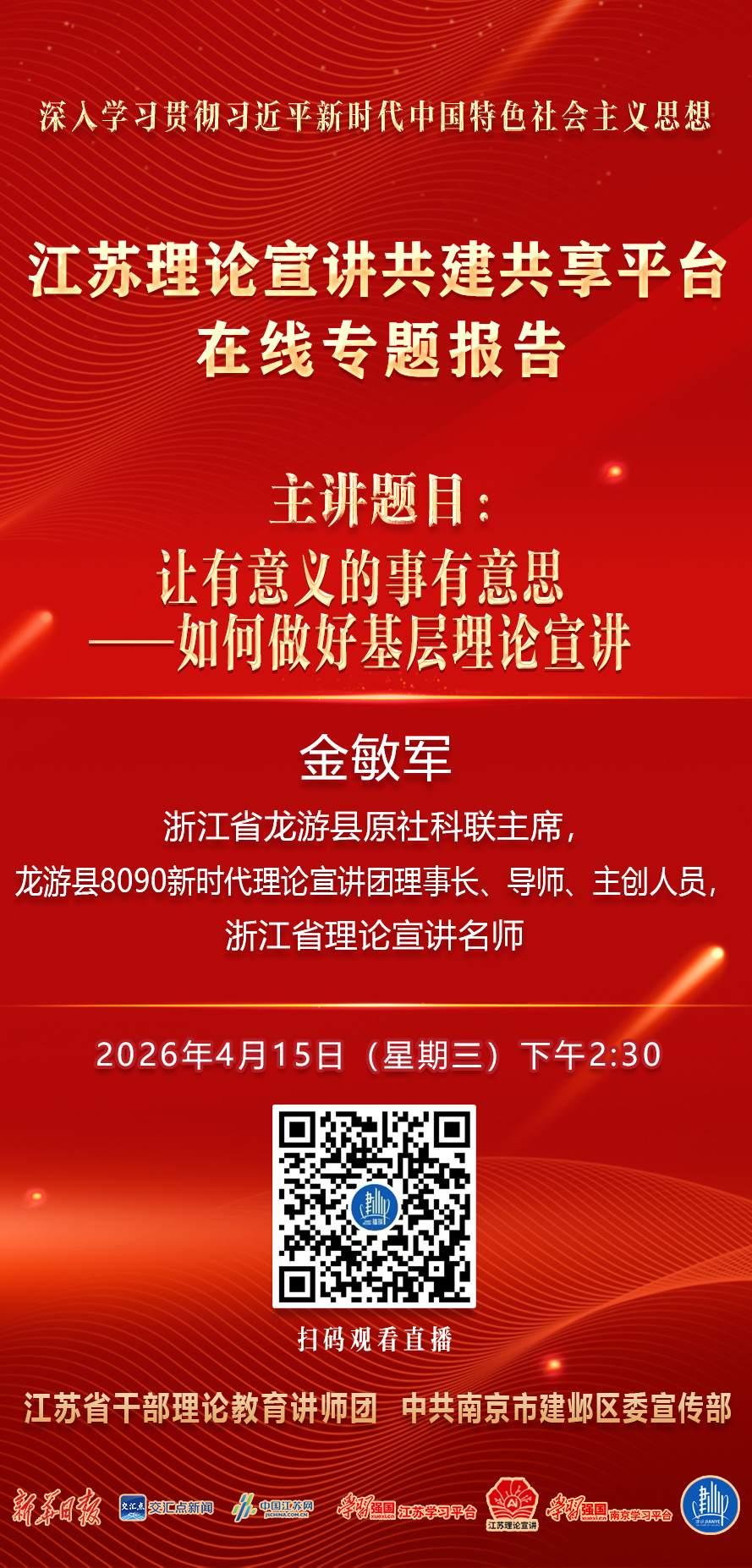 本期江苏理论宣讲共建共享平台在线专题报告邀请到浙江省龙游县原社科联主席,龙游县8090新时代理论宣讲团理事长、导师、主创人员,浙江省理论宣讲名师金敏军,以“让有意义的事有意思——如何做好基层理论宣讲”为主题,作专题报告。