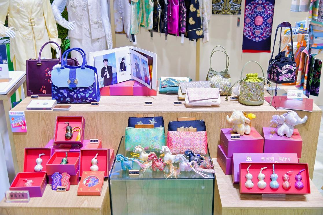 苏州龙泉禧里丝绸科技有限公司展位上,非遗盘扣、真丝方巾、新中式斜挎包等生活用品小巧精致,苏绣旗袍则端庄典雅。“今年我们与桃花坞木版年画合作联名,在文物中提炼传统纹样,将东方美学精髓融入服饰、文创等产品设计中,开启一场跨越时空的对话。”公司董事长黄秋停介绍。