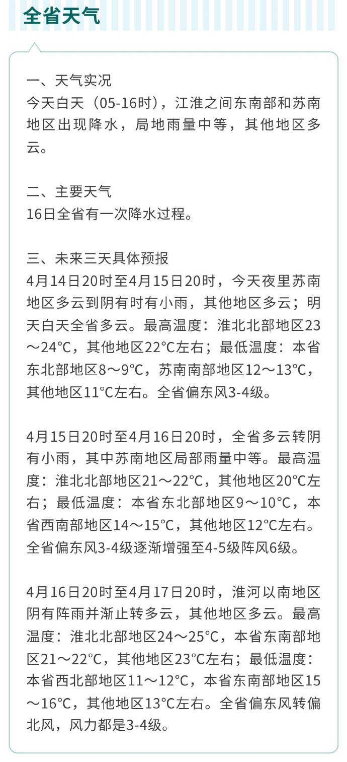 4月14日20时至4月15日20时,今天夜里苏南地区多云到阴有时有小雨,其他地区多云,明天白天全省多云,最高温度淮北北部地区23~24℃,其他地区22℃左右,最低温度本省东北部地区8~9℃,苏南南部地区12~13℃,其他地区11℃左右,全省偏东风3~4级。