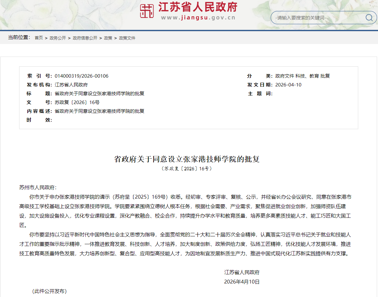 你市关于申办张家港技师学院的请示(苏府呈〔2025〕169号)收悉。经初审、专家评审、复核、公示,并经省长办公会议研究,同意在张家港市高级技工学校基础上设立张家港技师学院。学院要紧紧围绕立德树人根本任务,根据社会需要、产业需求,聚焦促进就业创业创新,加强师资队伍建设,加大设施设备投入,优化专业课程设置,深化产教融合、校企合作,持续提升办学水平和教育质量,培养更多高素质技能人才、能工巧匠和大国工匠。