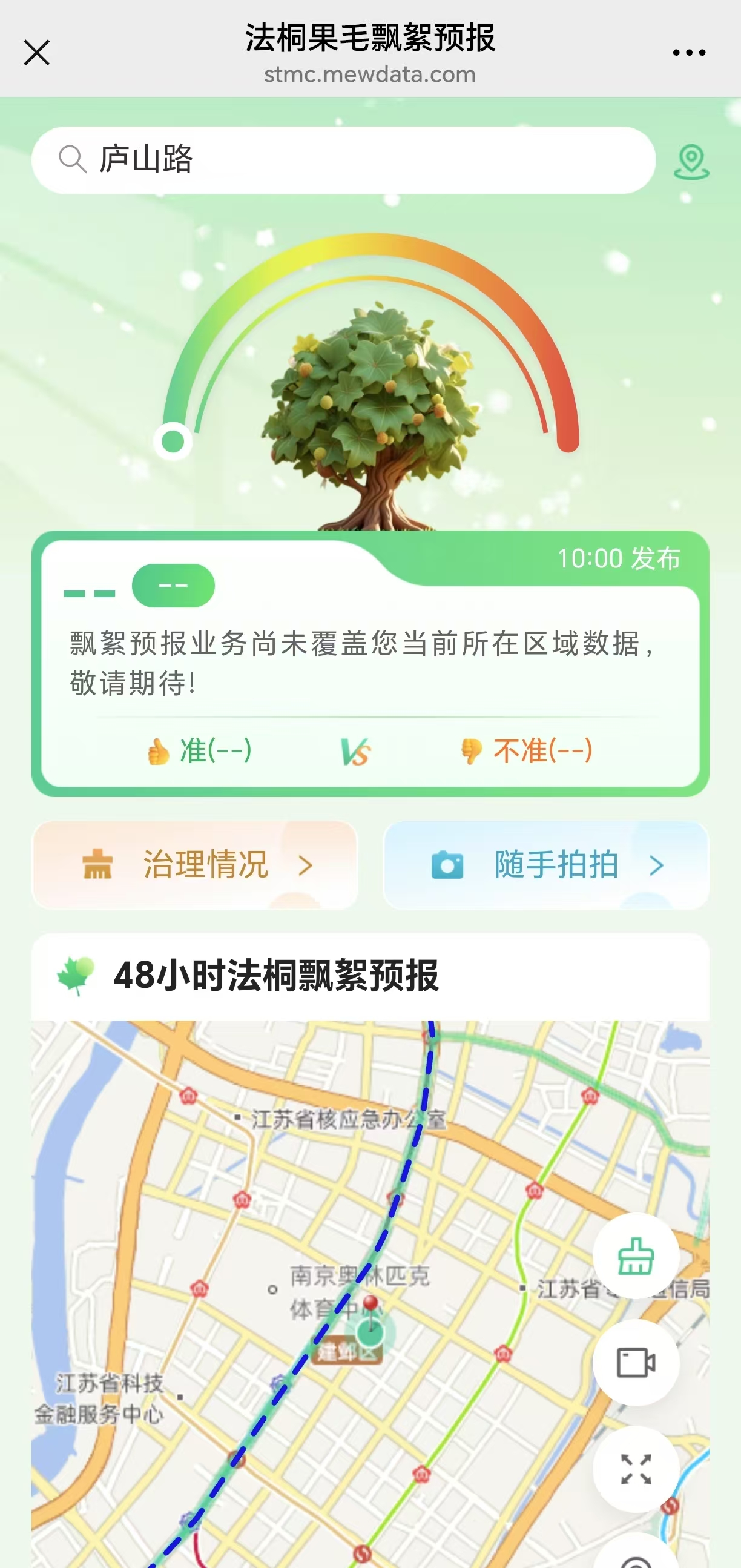 进入果毛飘絮预报系统,记者打开定位,看到附近区域24小时内逐小时精细化飘絮预报、72小时内的逐3小时趋势预报,以及各路段飘絮等级实时信息,这些信息以色块图、折线图、热力图等形式直观展示。市民游客可通过江苏气象官微查看飘絮情况。