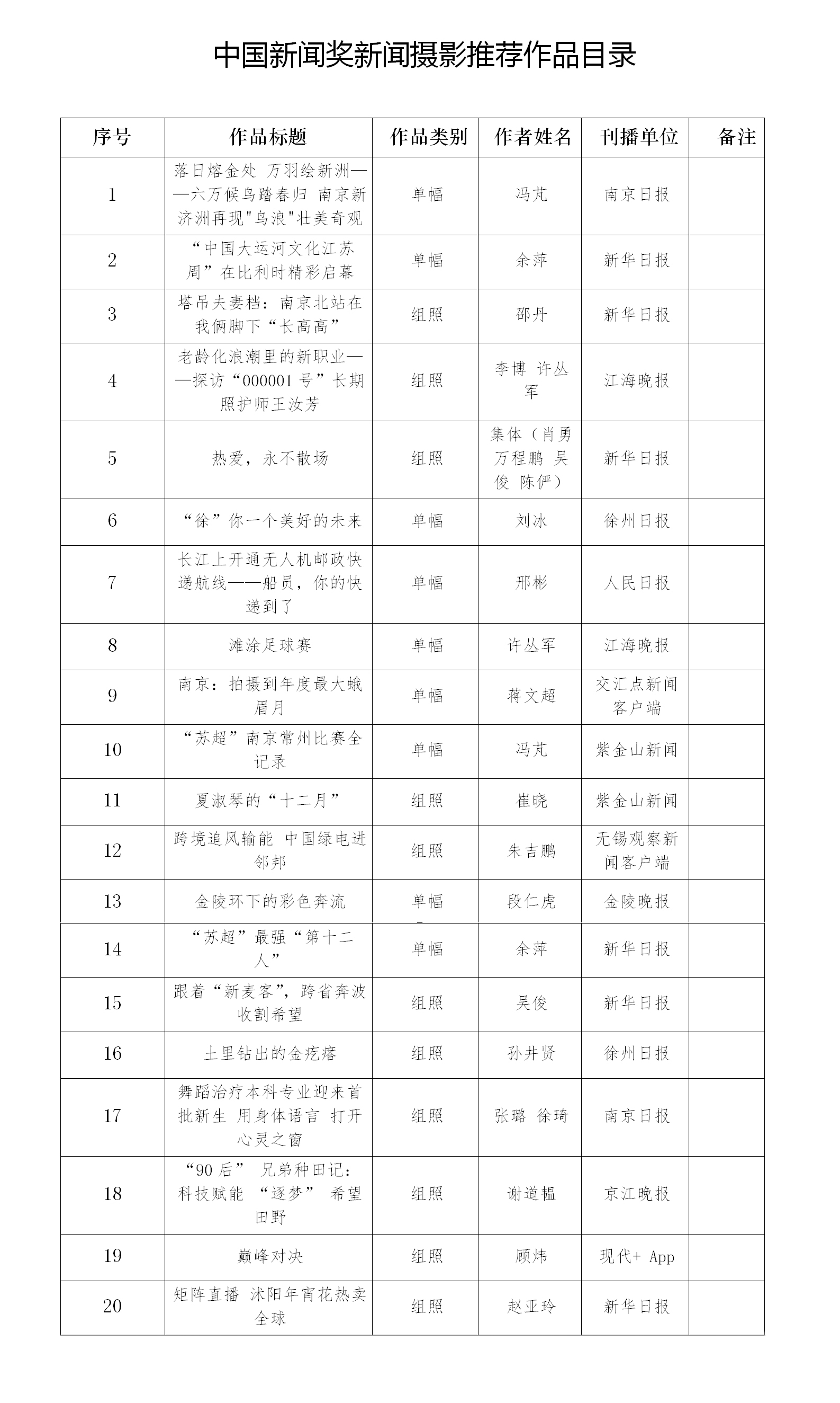 我省推荐参评第36届中国新闻奖新闻摄影专项初评作品共20件,今起开始公示,公示时间为2026年4月15日起5个工作日。公示期间,如有异议,请向江苏省新闻工作者协会秘书处反映。