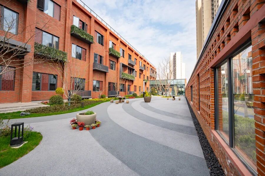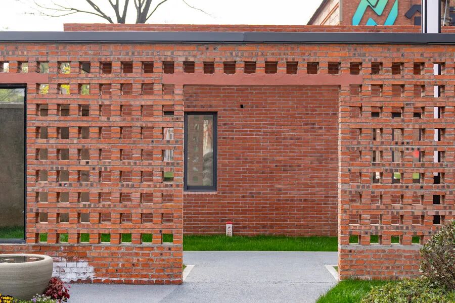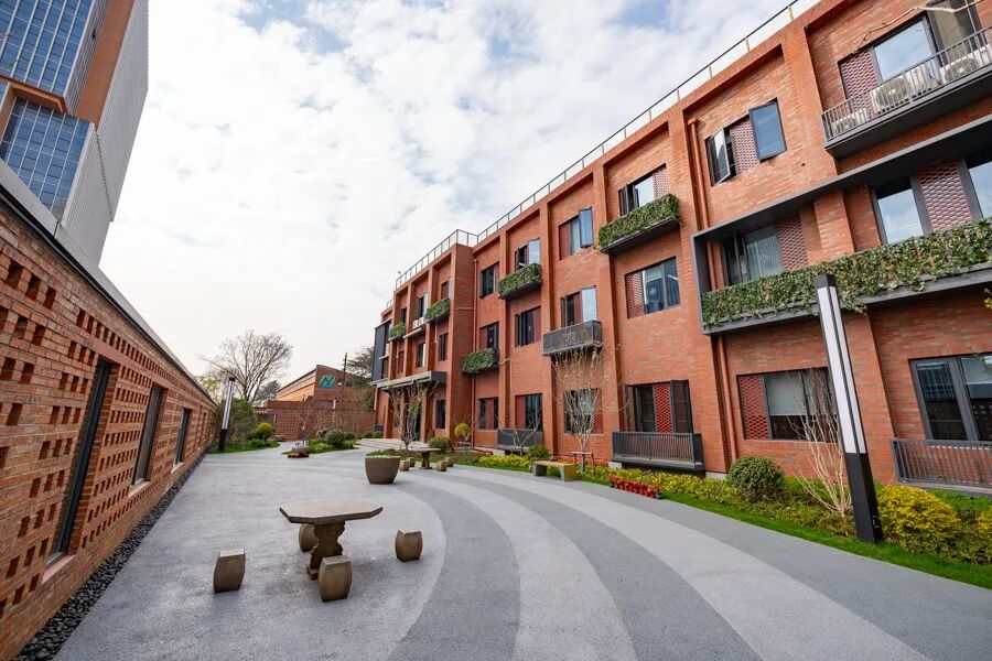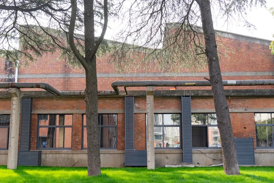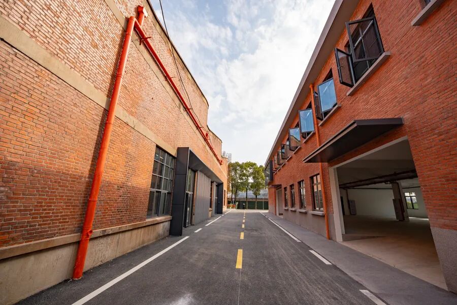 红砖灰墙映着参天梧桐,斑驳肌理藏着工业记忆。走进园区,十余栋红砖老厂房依旧矗立,每一处厂房轮廓都得以留存,工业时代的骨架依旧清晰可见。