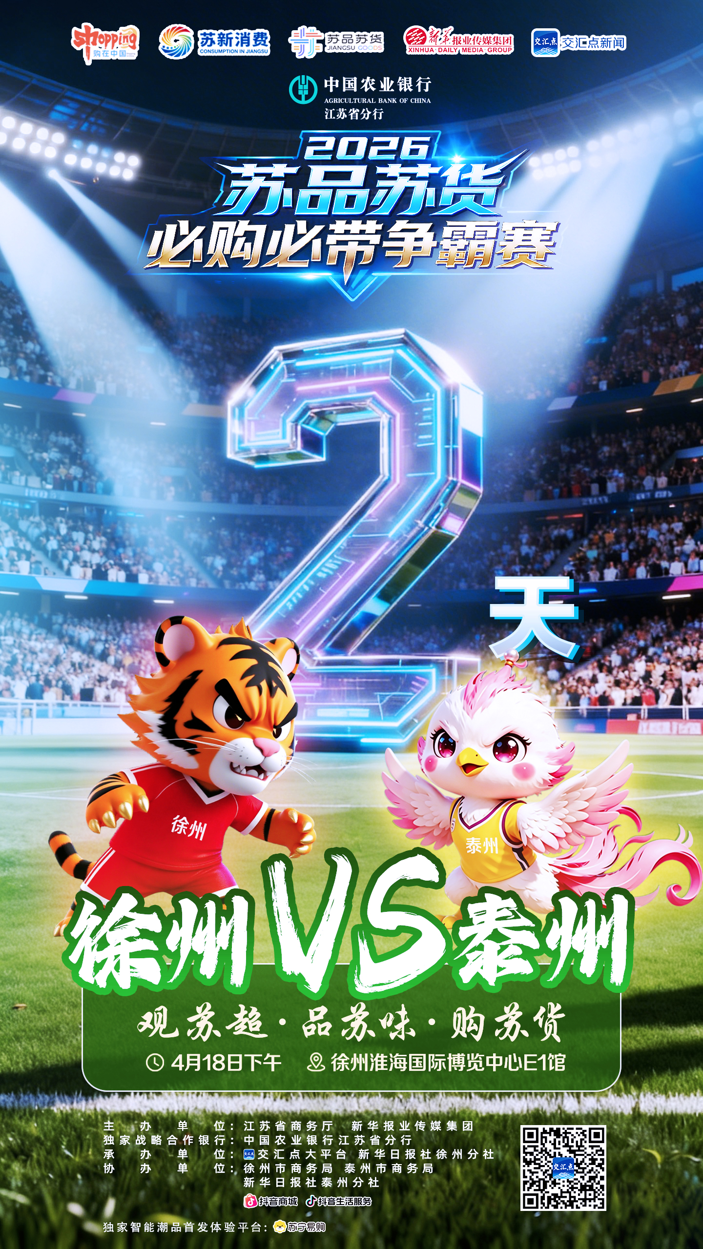 本次活动由江苏省商务厅、新华报业传媒集团主办,中国农业银行江苏省分行作为独家战略合作银行,交汇点大平台、新华日报社徐州分社承办,徐州市商务局、泰州市商务局、新华日报社泰州分社、抖音商城、抖音生活服务协办,苏宁易购为独家智能潮品首发体验平台。赛事深度绑定苏超赛程,以“文体商旅融合”创新模式,搭建城市好物竞技擂台,让江苏好物集中亮相,全力将赛场热度转化为消费热度,点燃全民购物热潮。