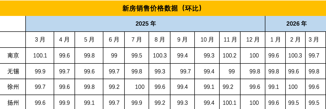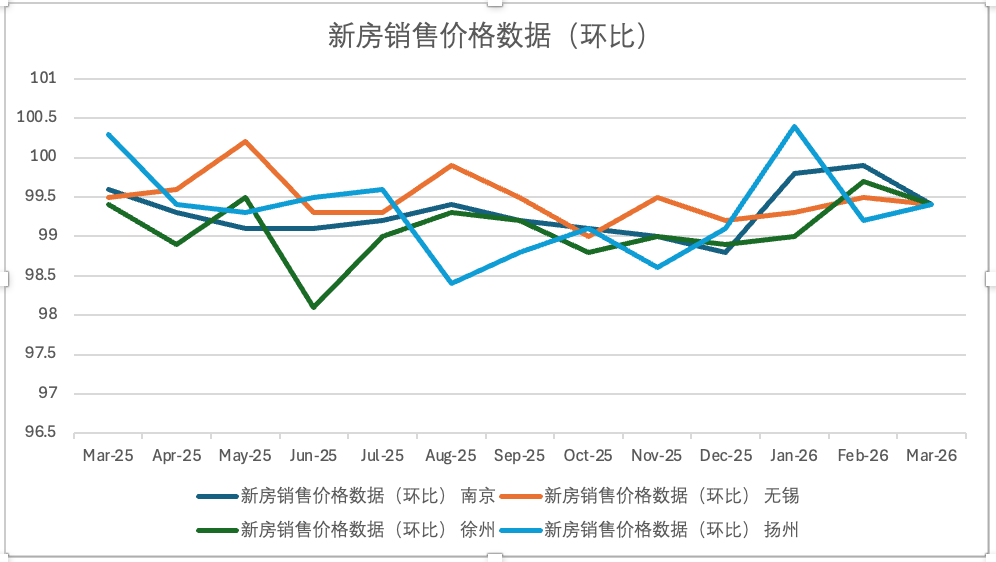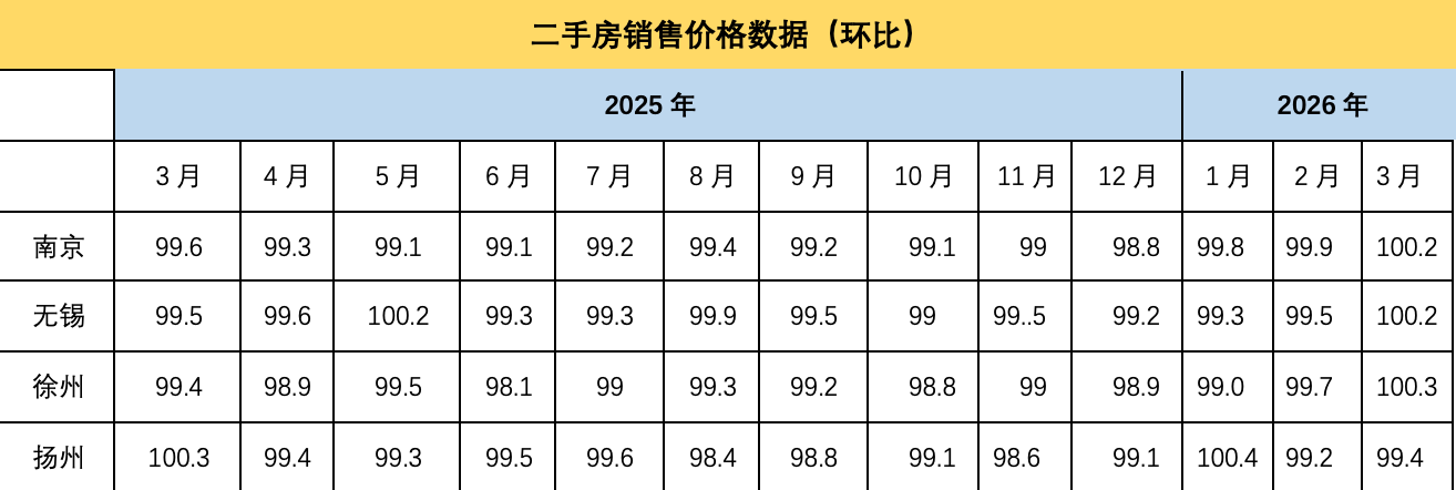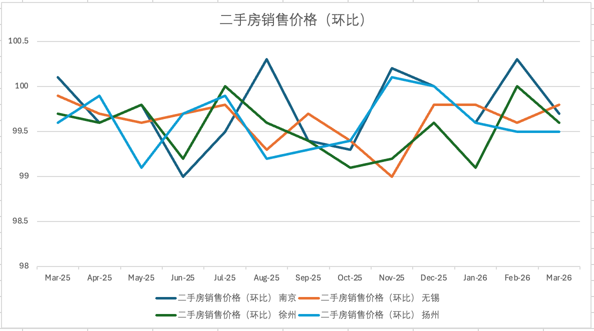 交汇点讯 4月16日,国家统计局发布2026年3月份70个大中城市商品住宅销售价格变动情况。数据显示,被列入统计的江苏四城中,二手房市场出现积极信号:南京、无锡、徐州环比均由降转涨,扬州虽小幅下降但降幅收窄;新房市场四城仍呈微降态势,但降幅总体平稳,与全国二三线城市趋势一致。