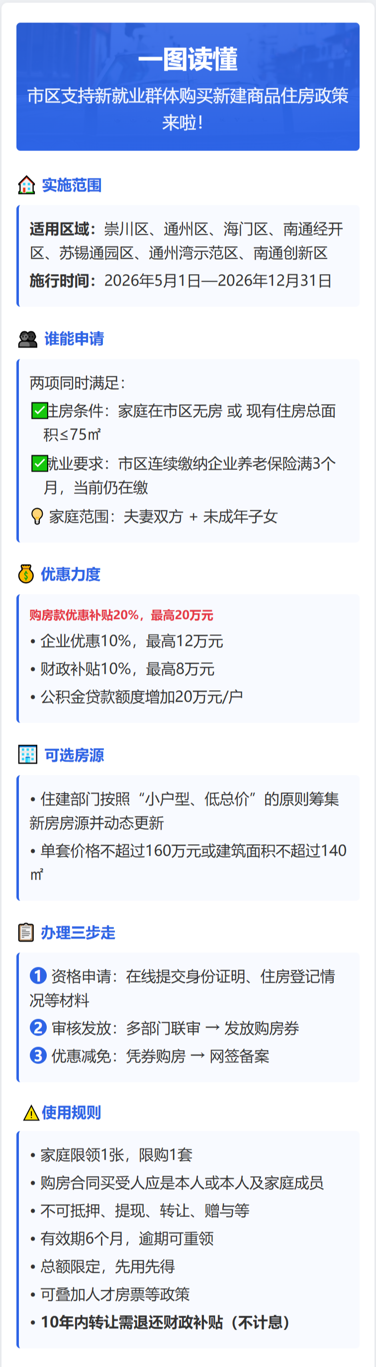 交汇点讯 4月16日,南通市住房和城乡建设局联合多部门发布住房惠民政策,针对市区新就业群体推出新建商品住房购房支持举措,申请人通过申领购房券可直接享受购房款总额20%的优惠,单户优惠最高可达20万元。政策自2026年5月1日起施行,有效期至2026年12月31日。