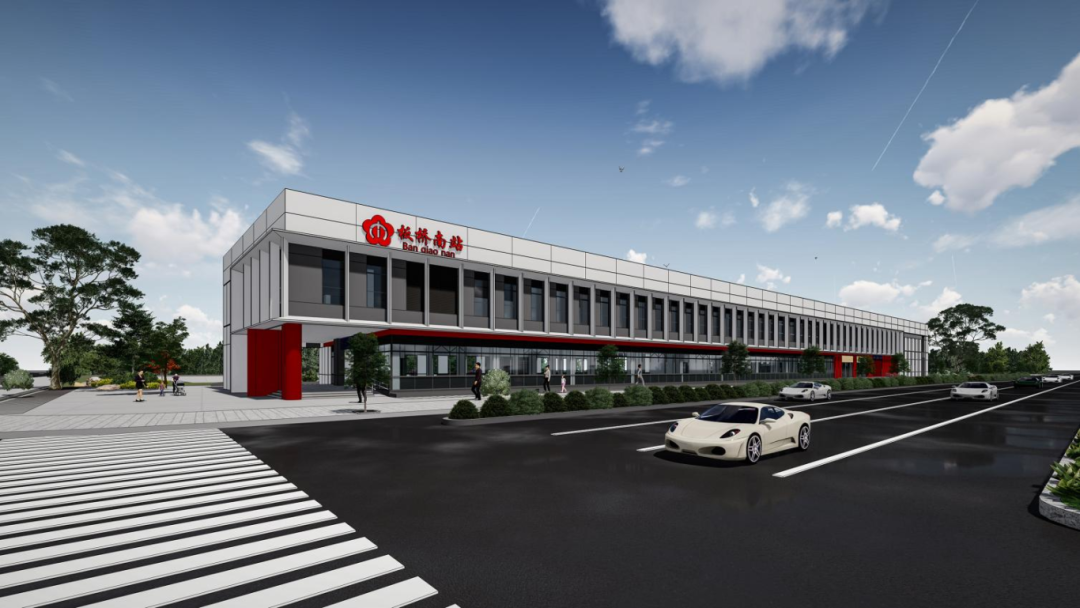 板桥南站为地下站,地上设两层站房,地下设计下沉广场。车站以“展望之窗”为理念,二层设计以“窗口形态”与竖向线条为主。