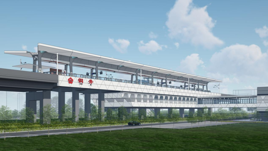 铜井站为路中高架岛式站。作为宁马城际到达南京的“门户”车站,以“破茧成蝶”为设计灵感,通过“双柱异距”悬挑结构,实现形态创新与结构节约的设计突破。