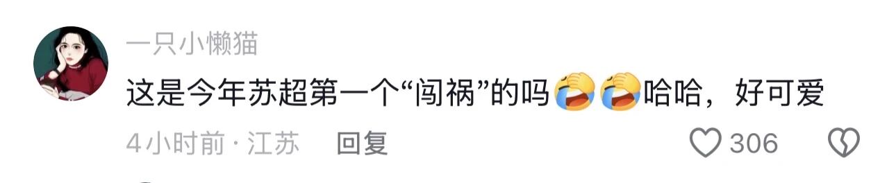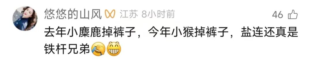 网友们没有追着嘲讽,反而纷纷留言“这是今年苏超第一个‘闯祸’的吗,哈哈,好可爱”“去年小麋鹿掉裤子,今年小猴掉裤子,盐连还真是铁杆兄弟”……善意的调侃取代了恶意消费,让猴宝“倒霉又豁达”的人设,一夜之间深入人心。